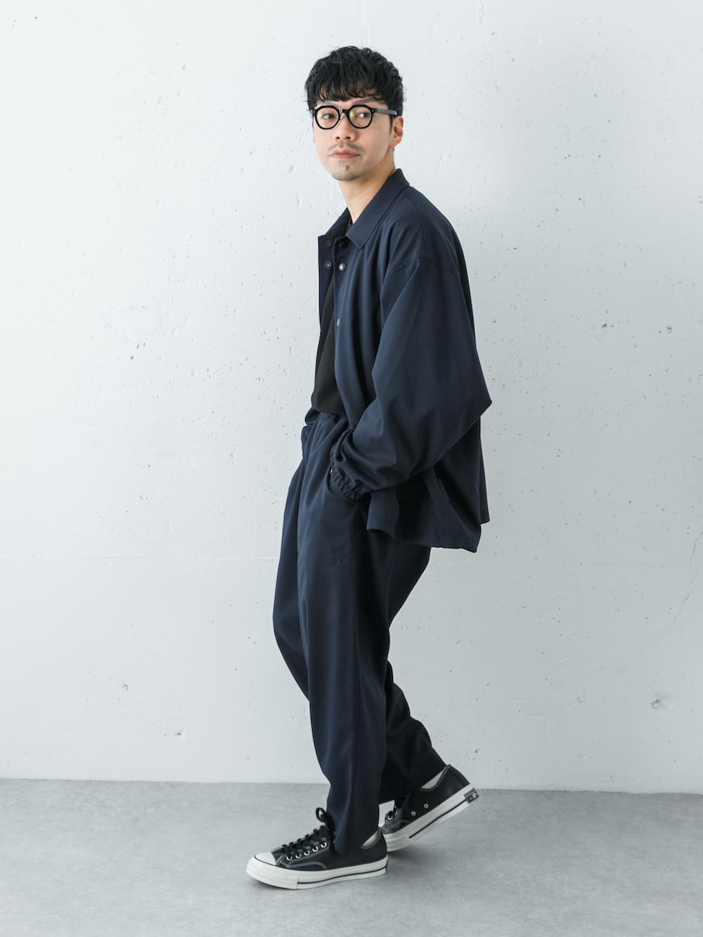 WideDadのワイドシルエットのコーチジャケットとスラックスを上下で合わせたセットアップスタイル!