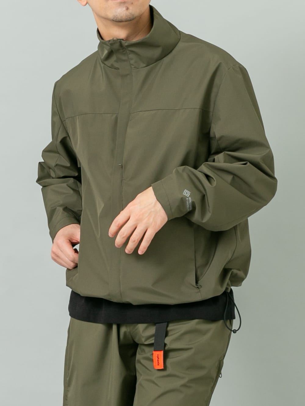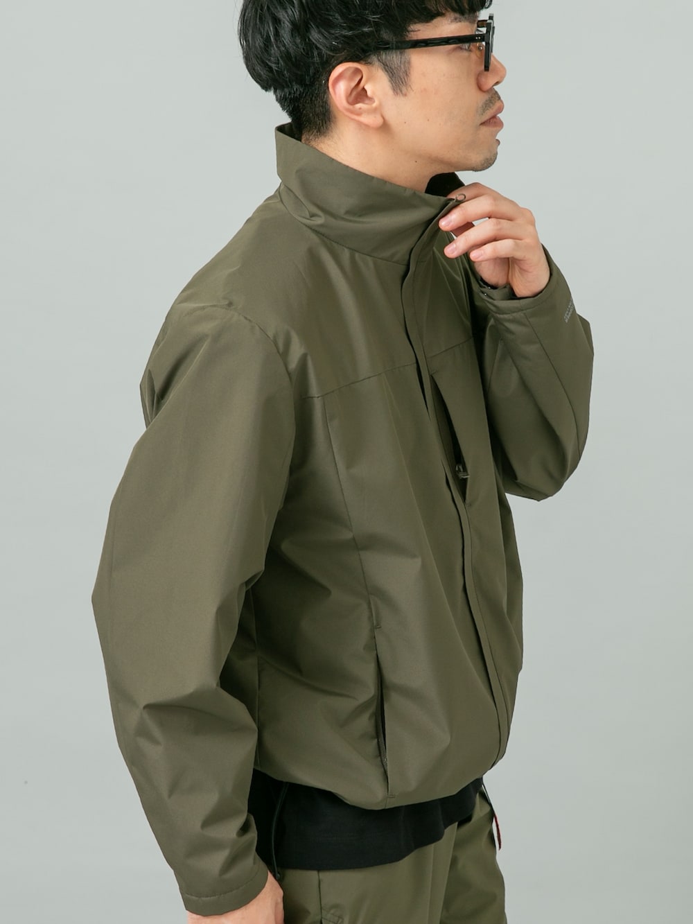 スタンドジャケットのジップを閉めてドローコードをキュッと絞ってインナーを見せたレイヤードスタイル。