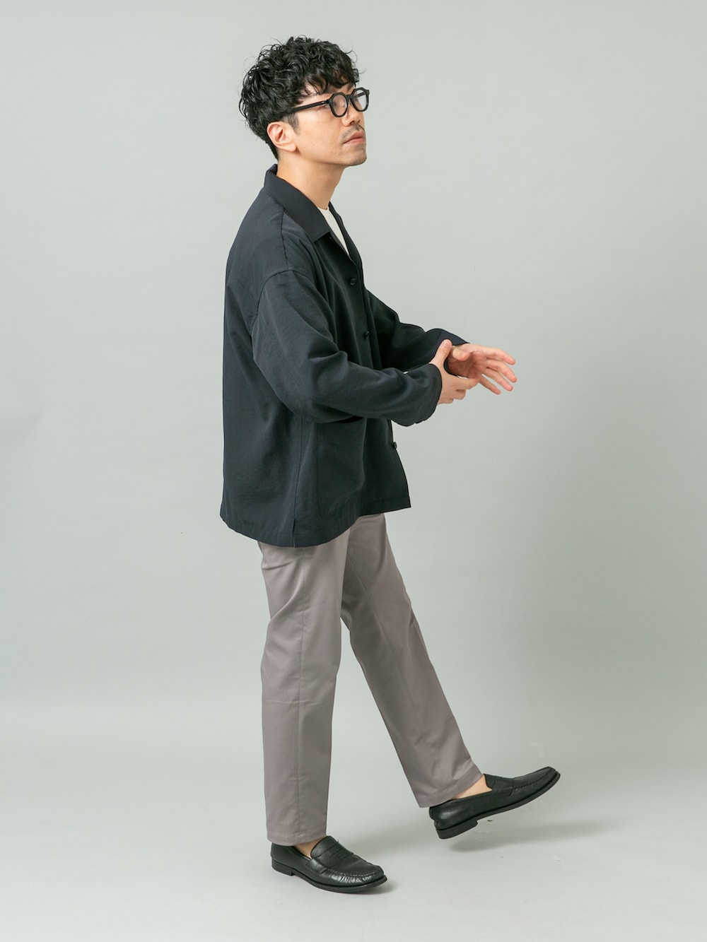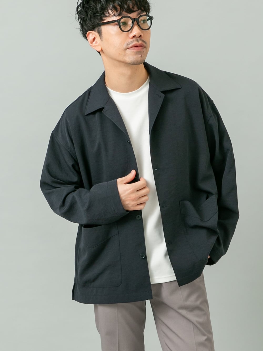 シャツジャケットの様な感覚で着られるアウターにチノスラックスを合わせたキレイめカジュアルコーデ。