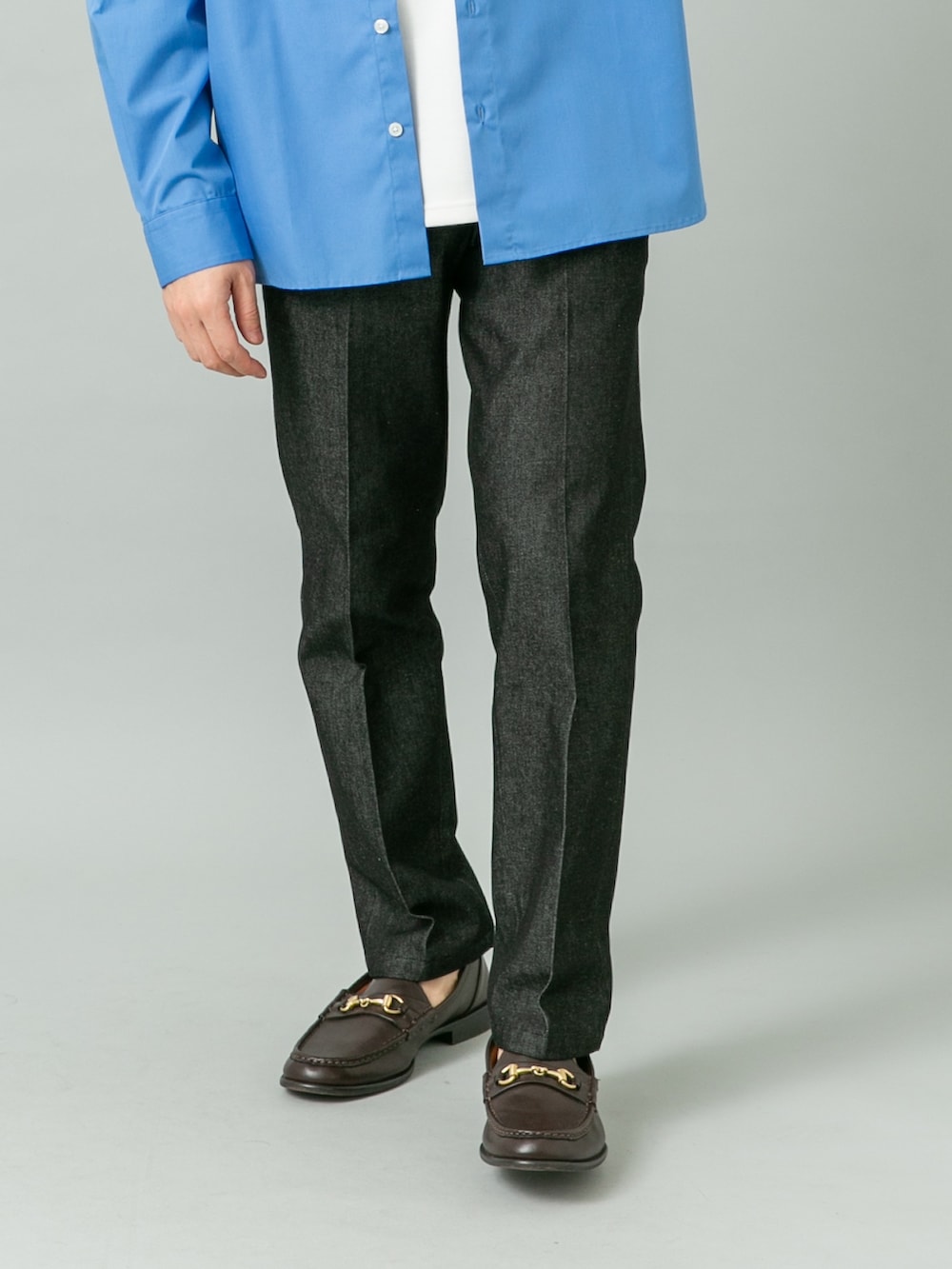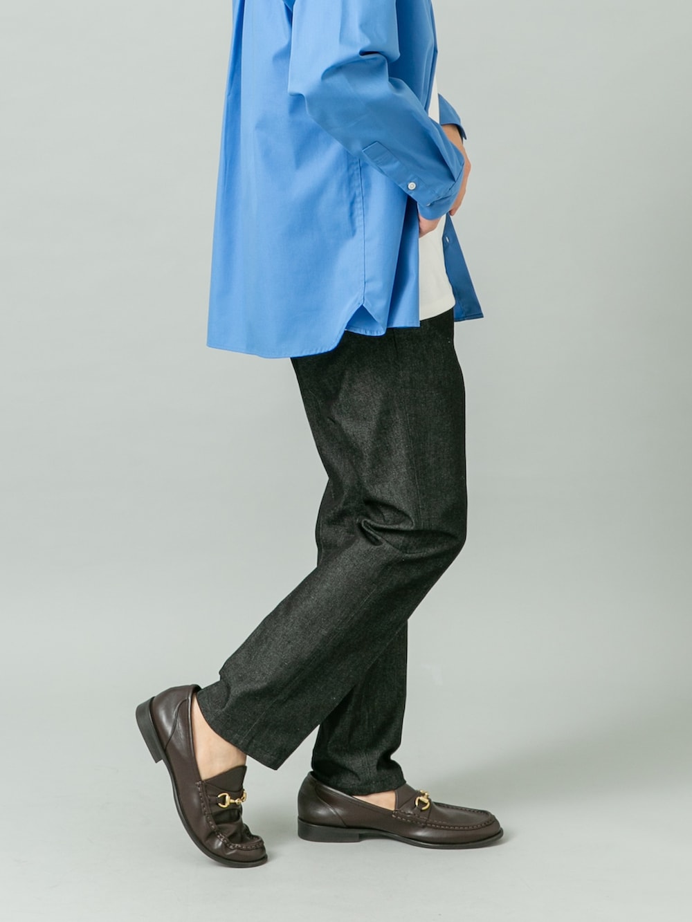 リラックス感のあるきれいめブロードシャツにスッキリシルエットのデニムスラックスを合わせてきれいめカジュアルに。
