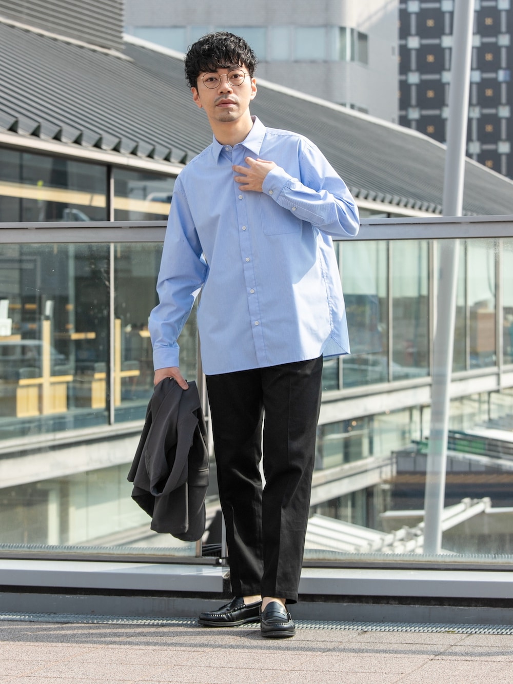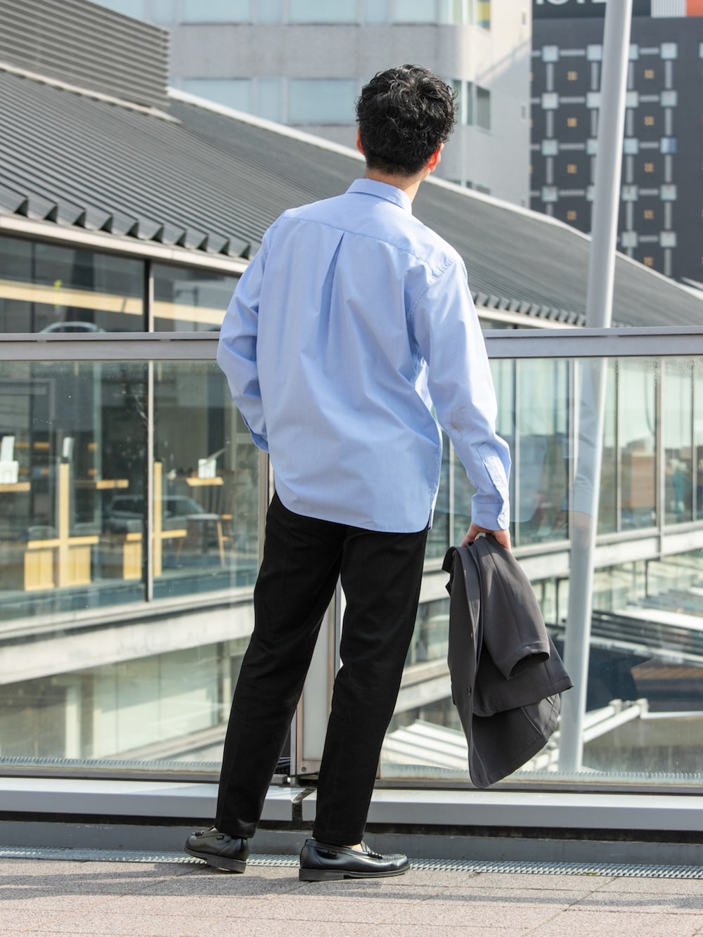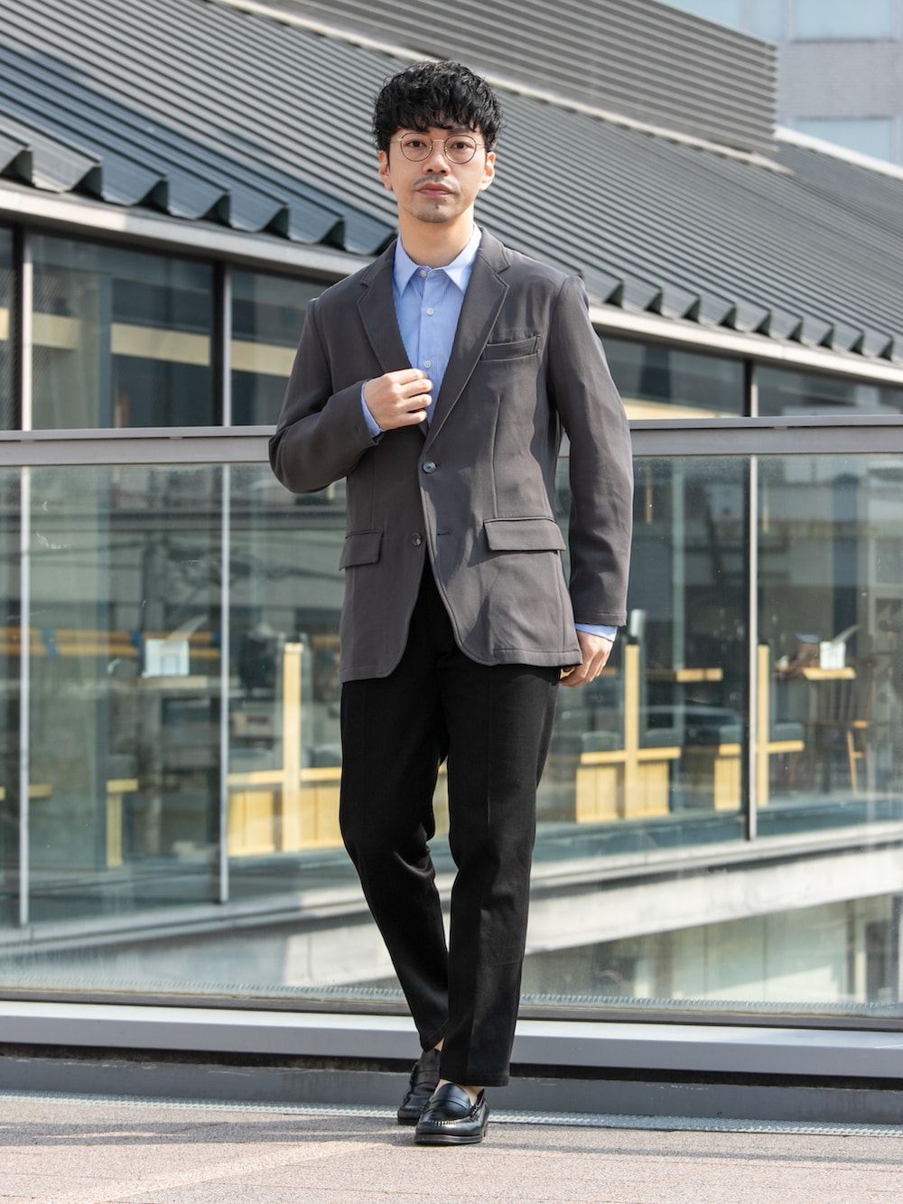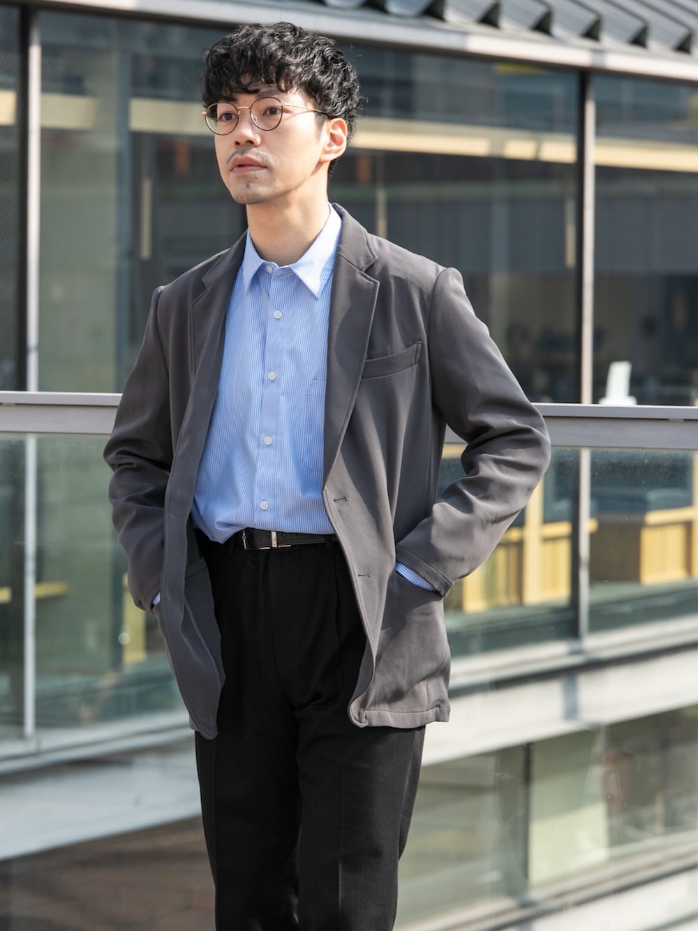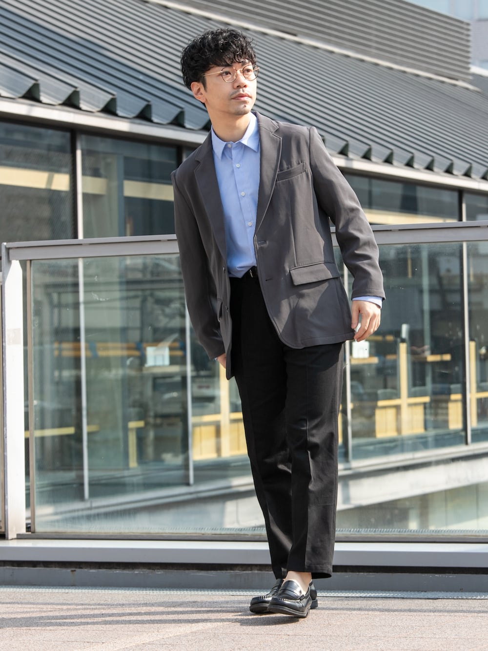 カラーはグレーとブラックの落ち着いた色合わせにブルーのストライプシャツをアクセントに。