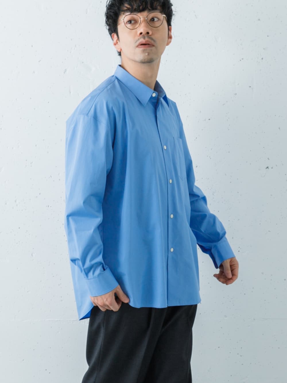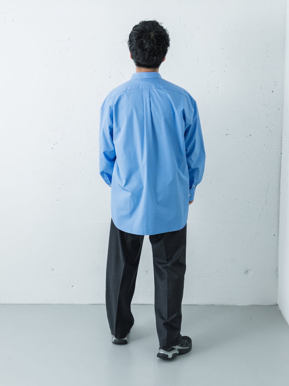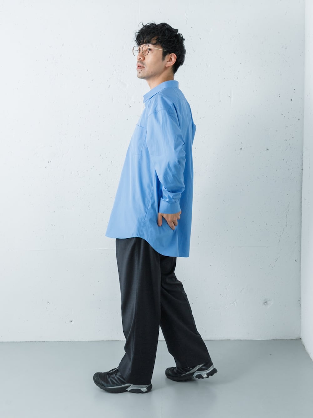 トーマスメイソンの定番シャツに上質なスラックスを合わせてキレイめにして、足元はスニーカーで抜け感を出して決めすぎずスマートにしました。