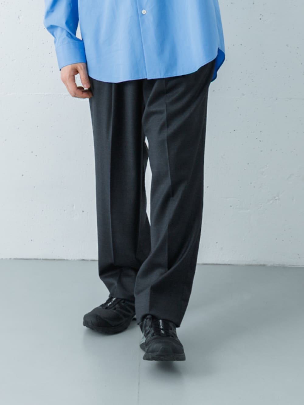 パンツはウールシルクの上質スラックスで程よいワイド感で柔らかい素材がカジュアルを上品に仕上げてくれます!