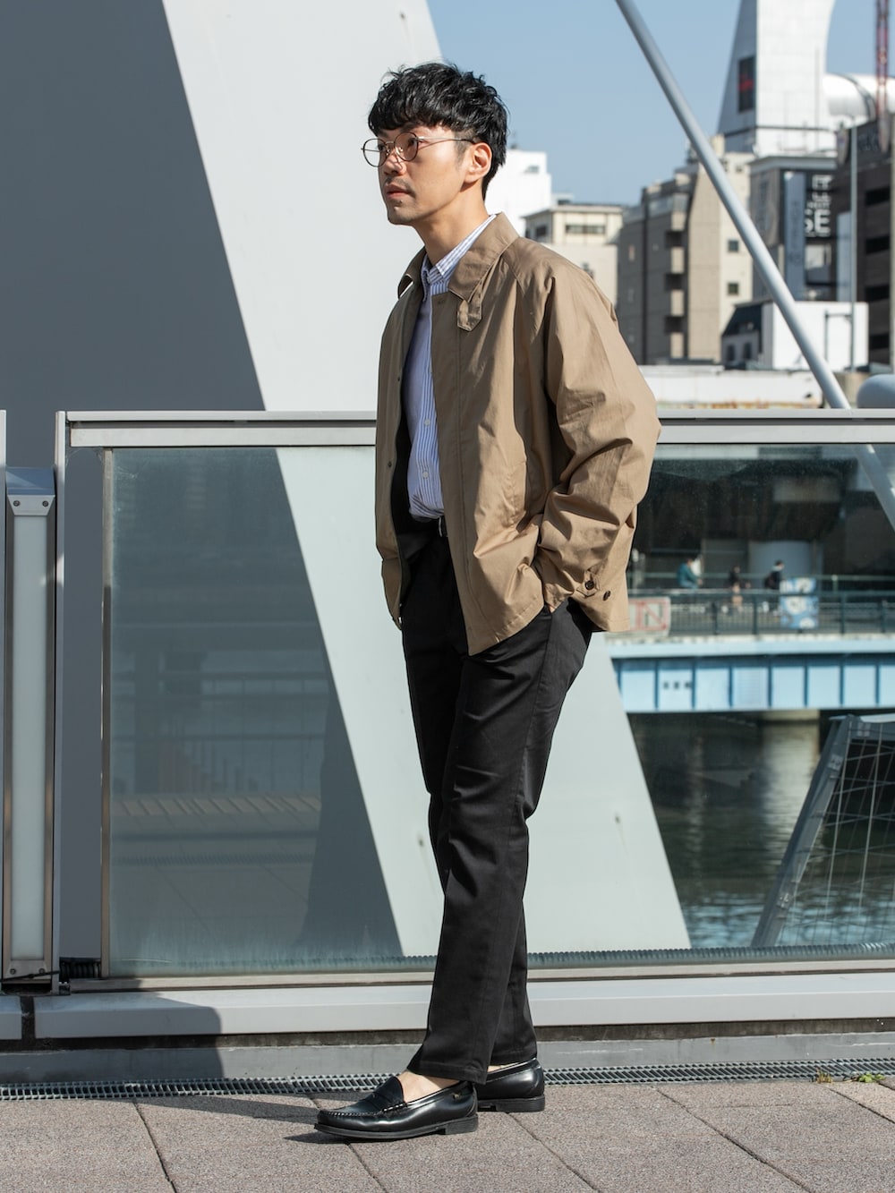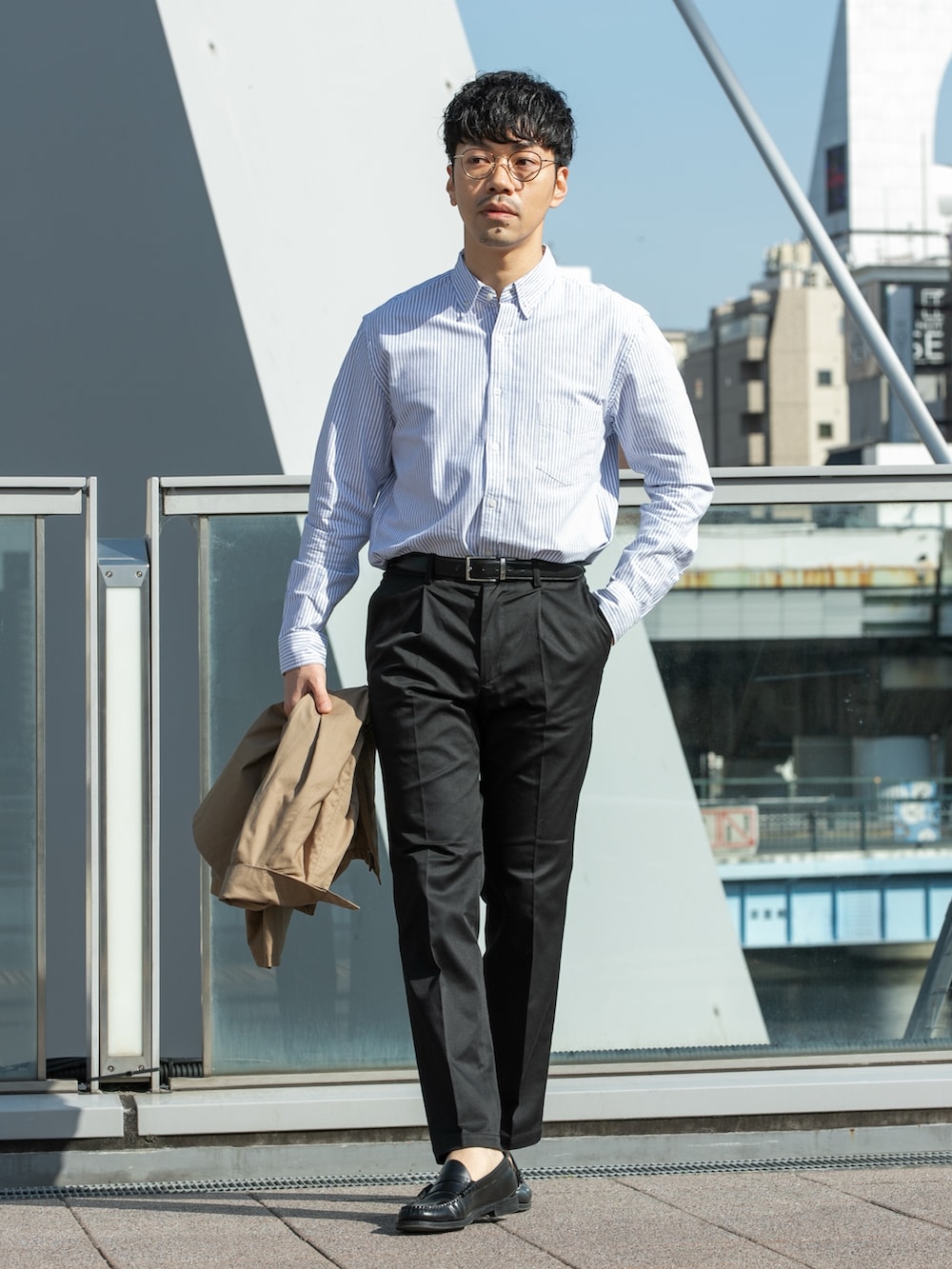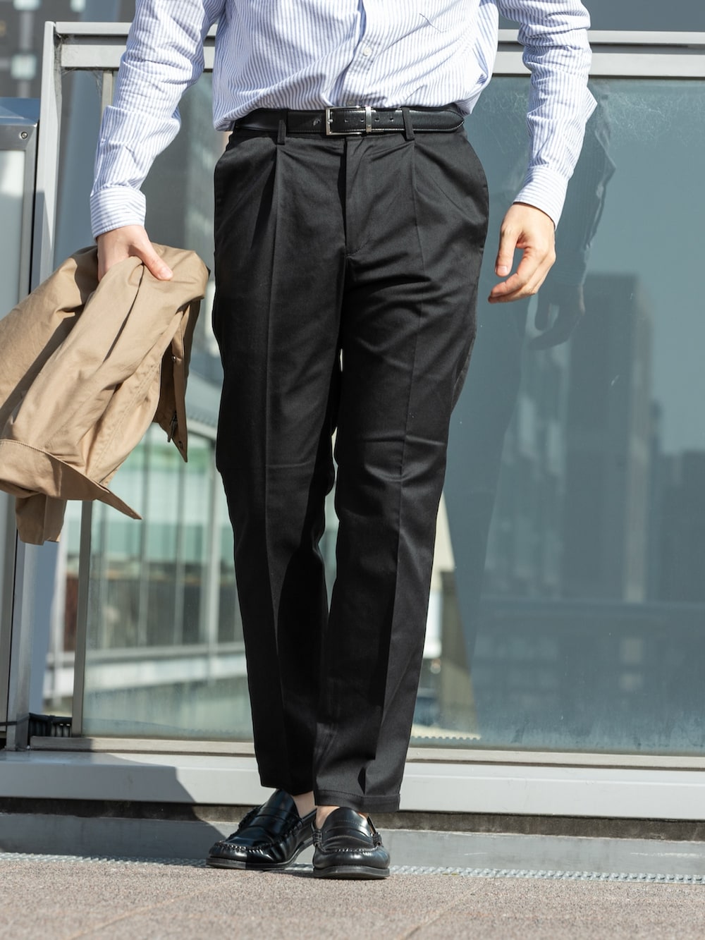 パンツは光沢感のあるブラックで落ち着いた印象も忘れずに◎