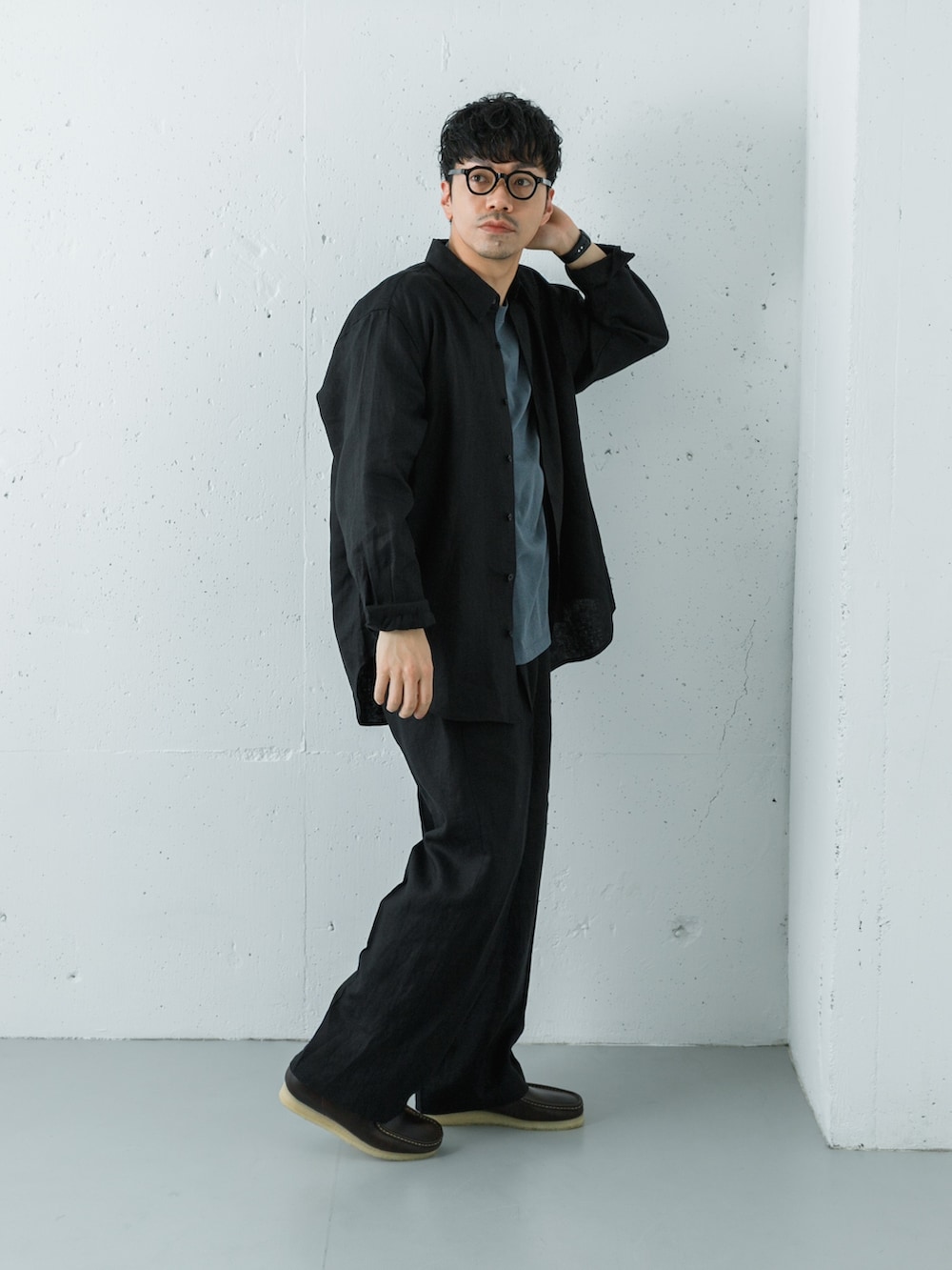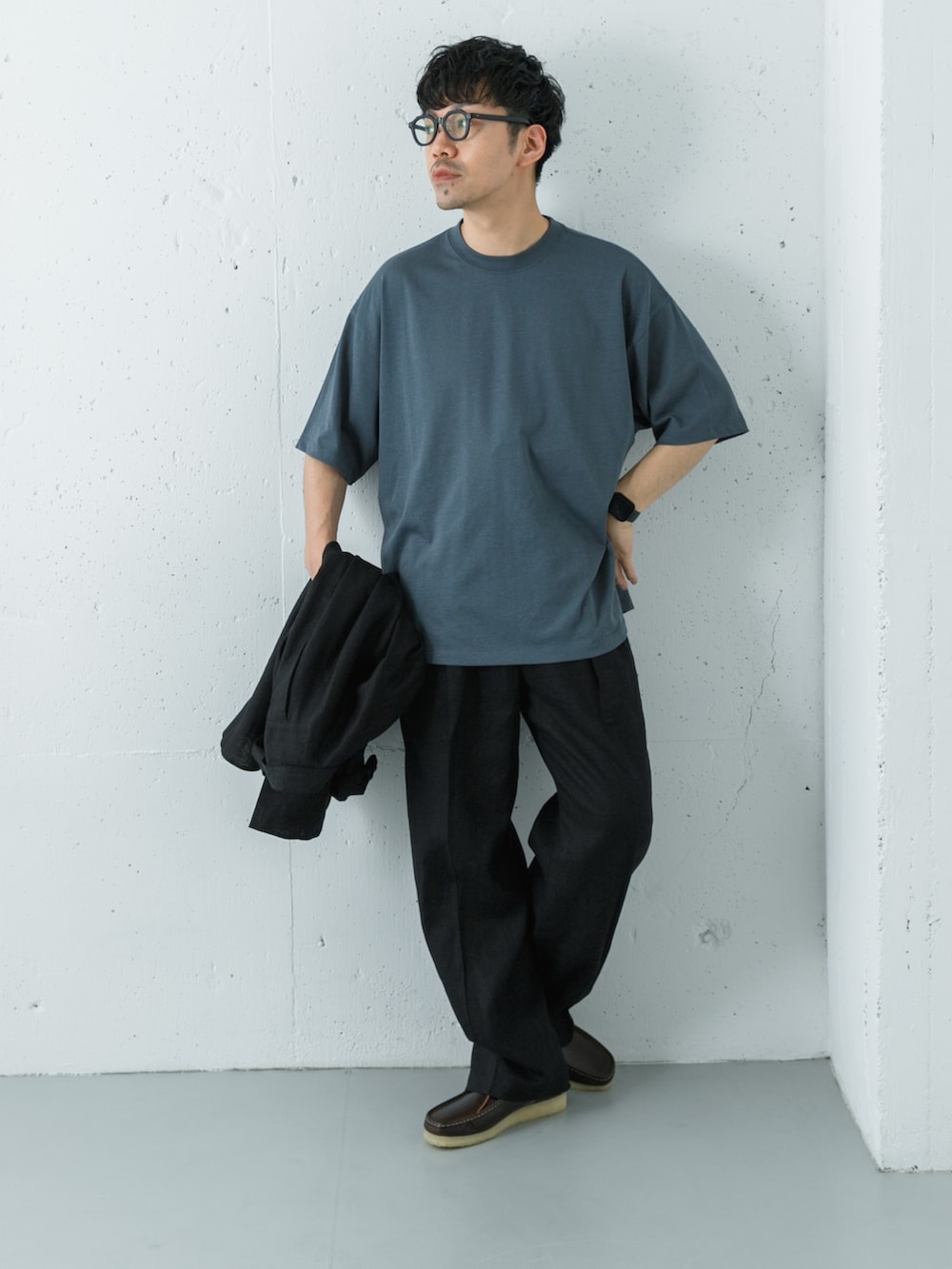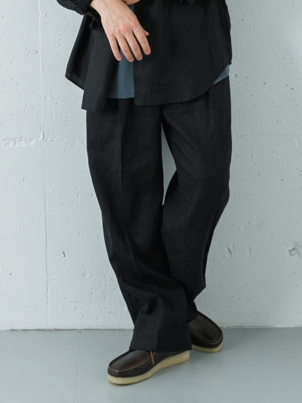 スラックスのシルエットをワイドにしているのですっきりとした印象にまとまります。
