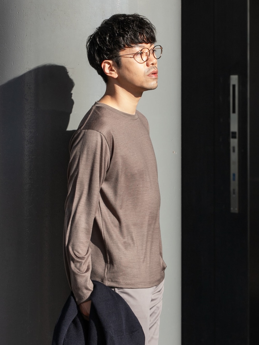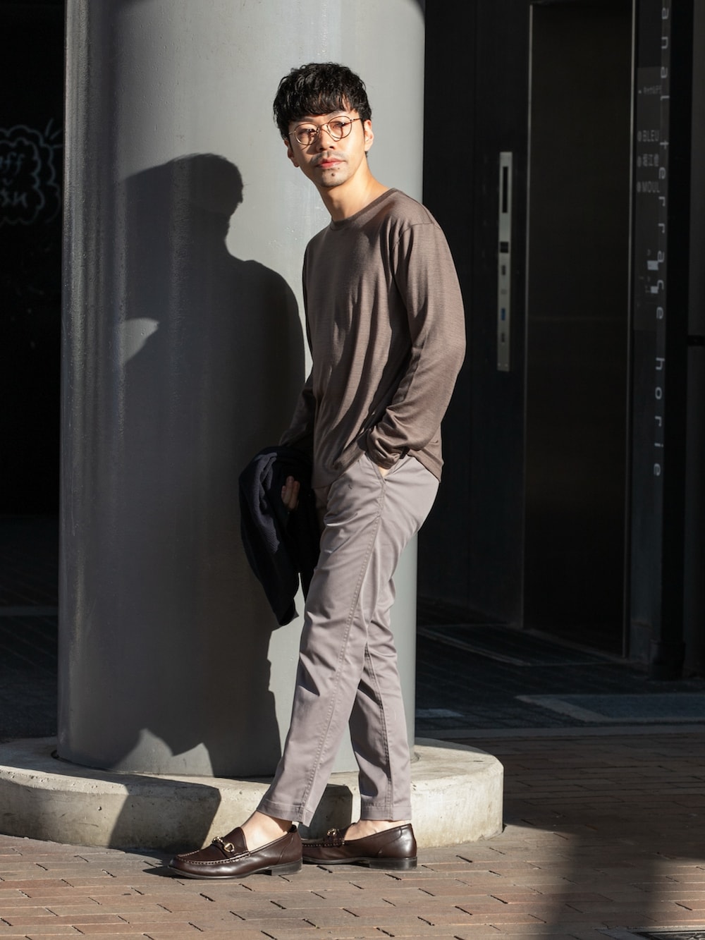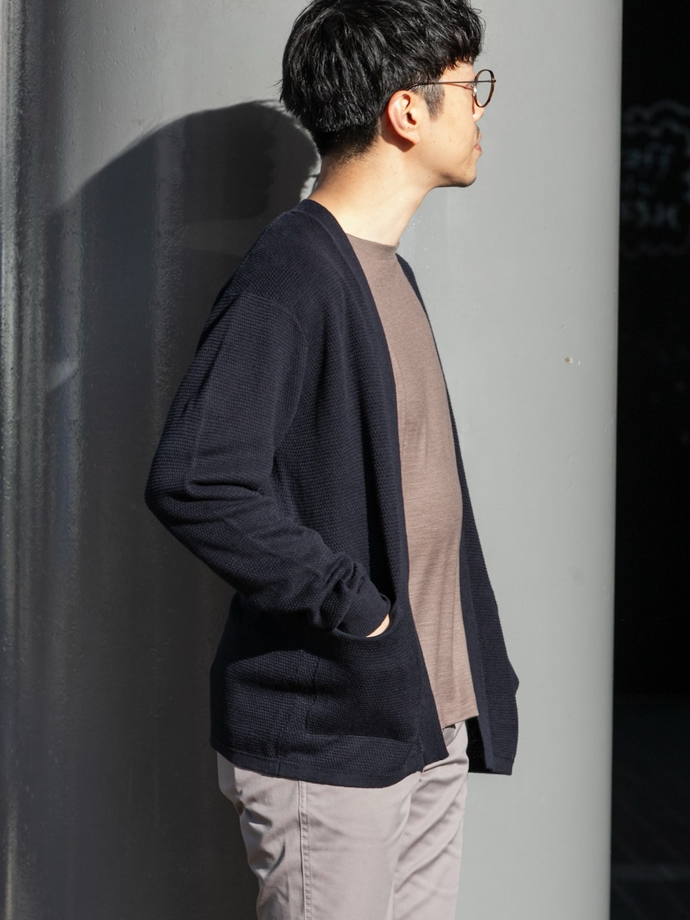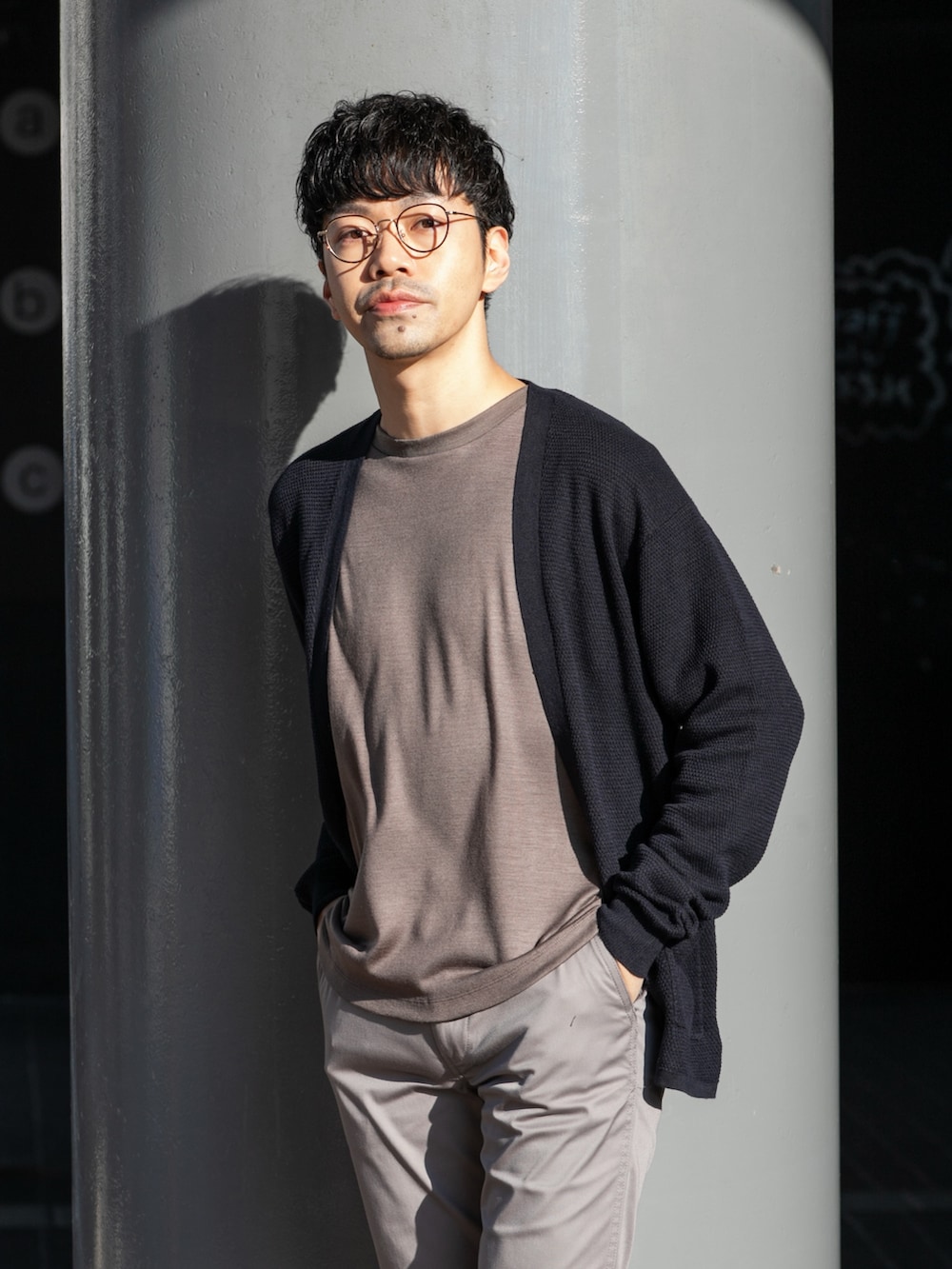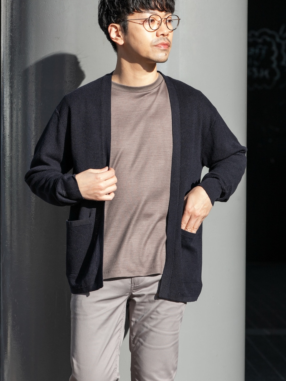 オリジナルの鹿の子カーディガンとウールTシャツを組み合わせてキレイめな印象で、パンツも細めにしてスマートなコーディネート。