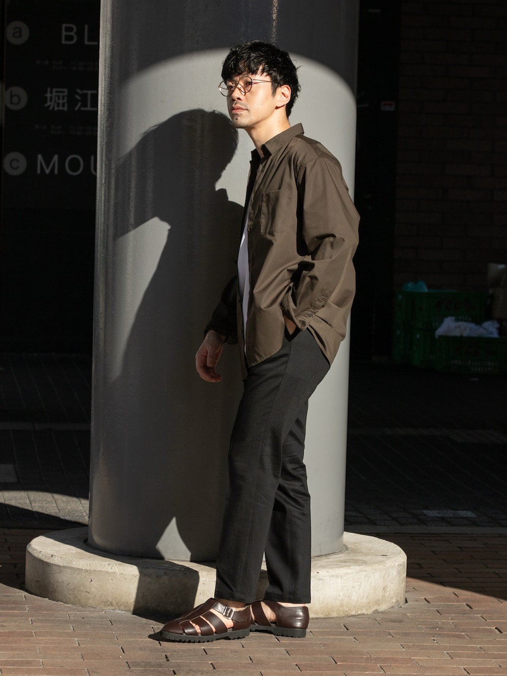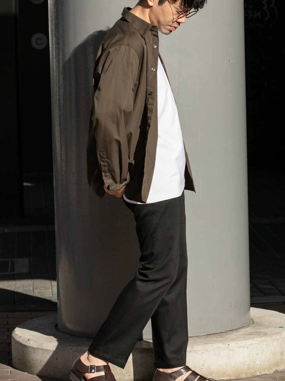 カラーはカーキとブラックでカジュアルな色合わせにしてキレイめなスタイリングに合わせました。