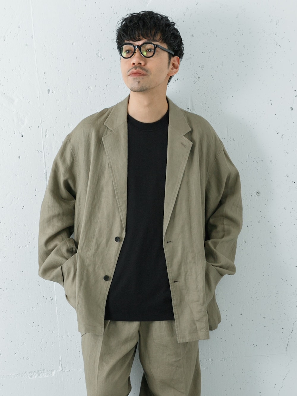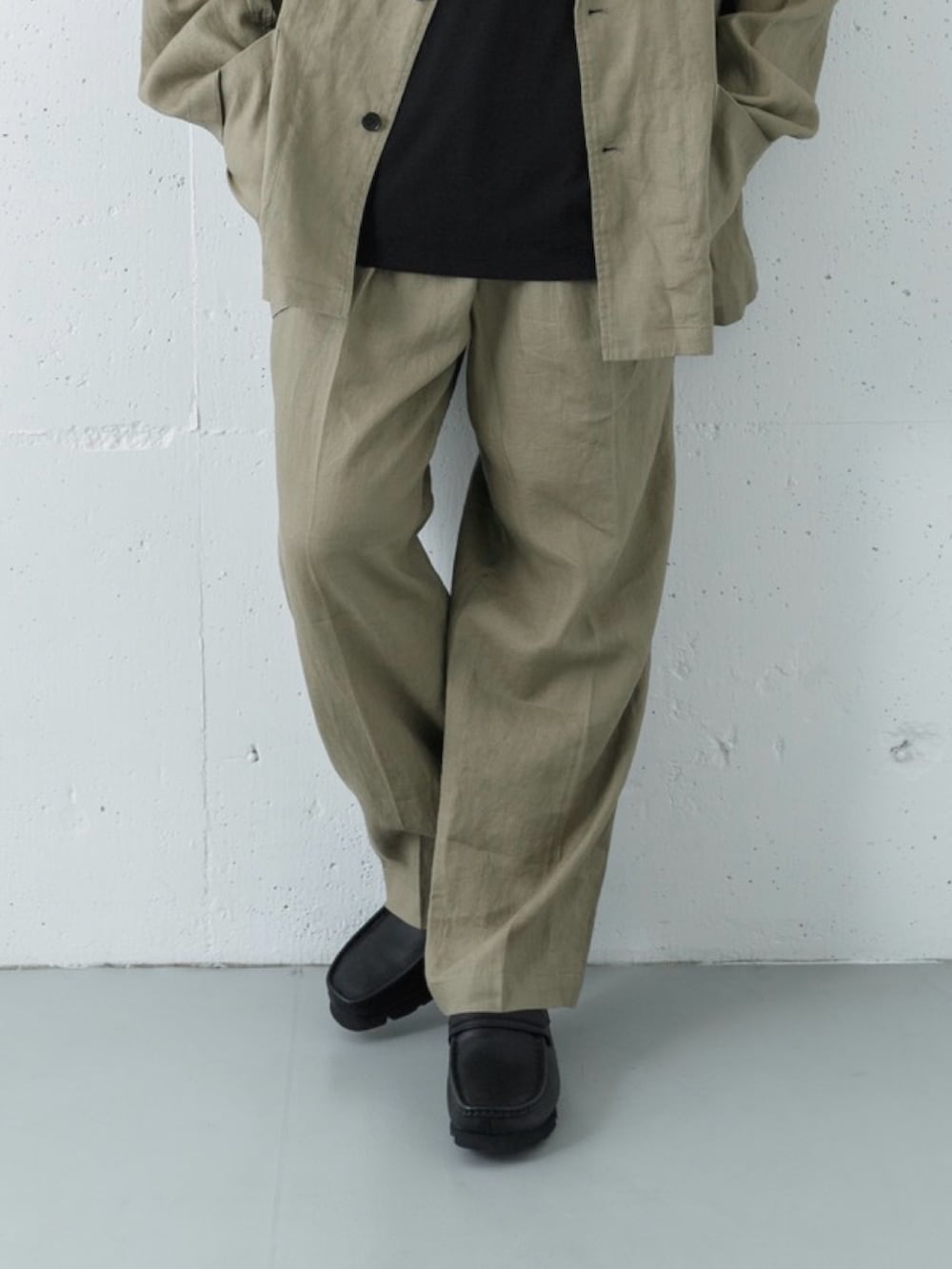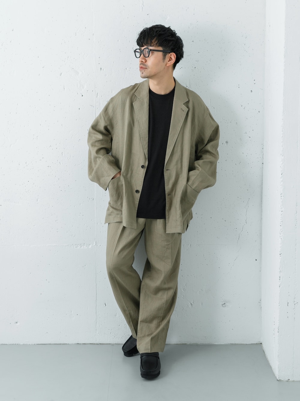 上質なフレンチリネンジャケットとパンツでセットアップにしてローファーできれいめにしました。