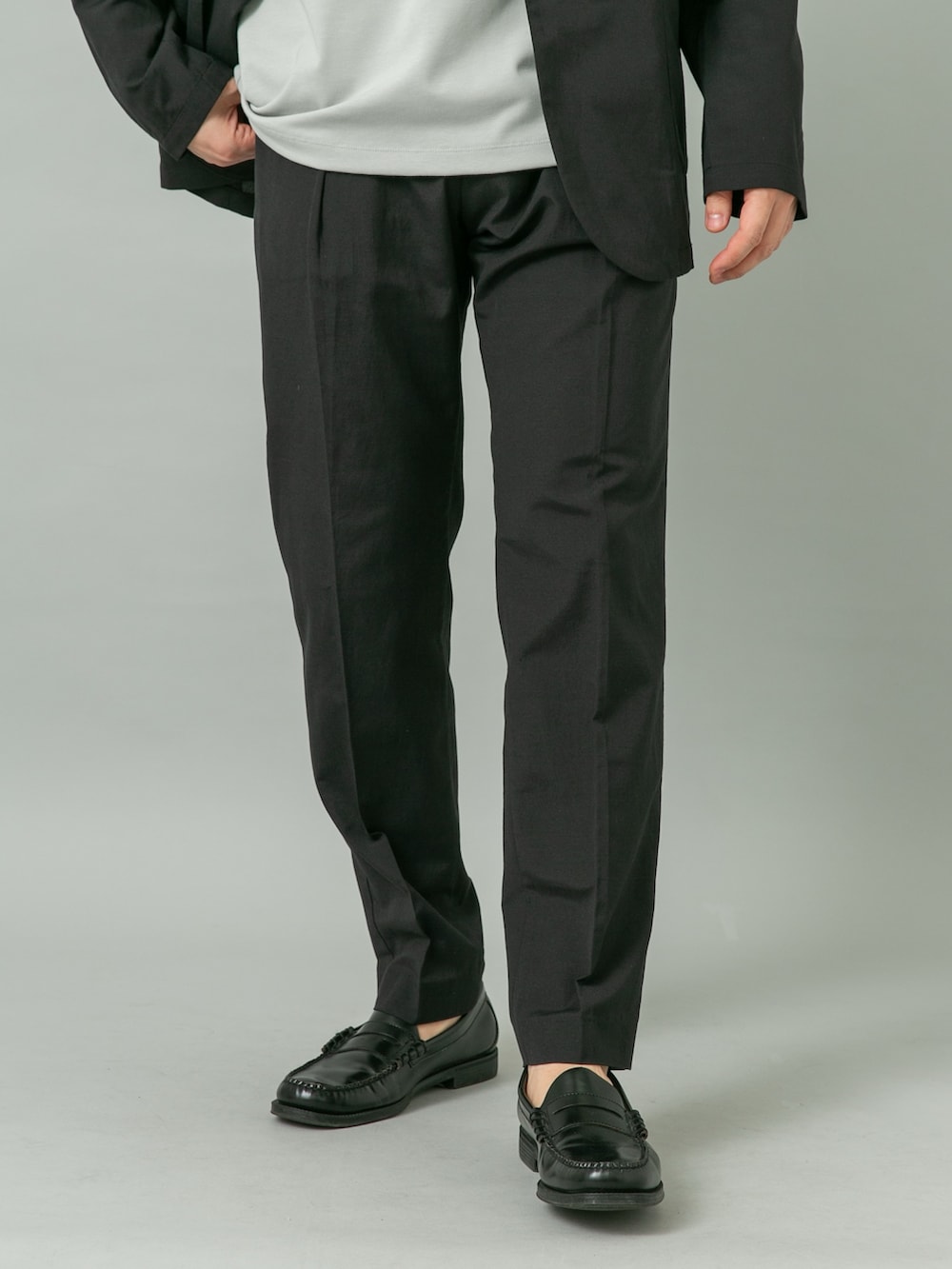 シワが気にならない機能性リネンを使用したセットアップに、コットン見えのひんやりTシャツと合わせました。