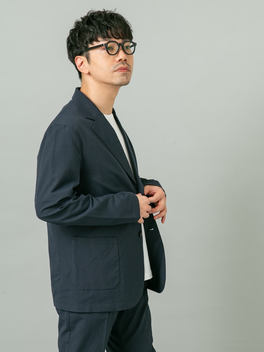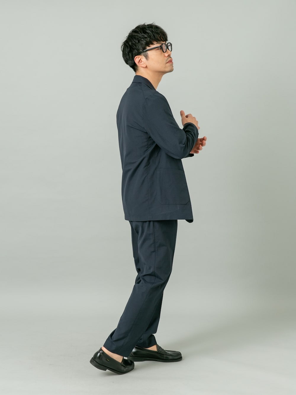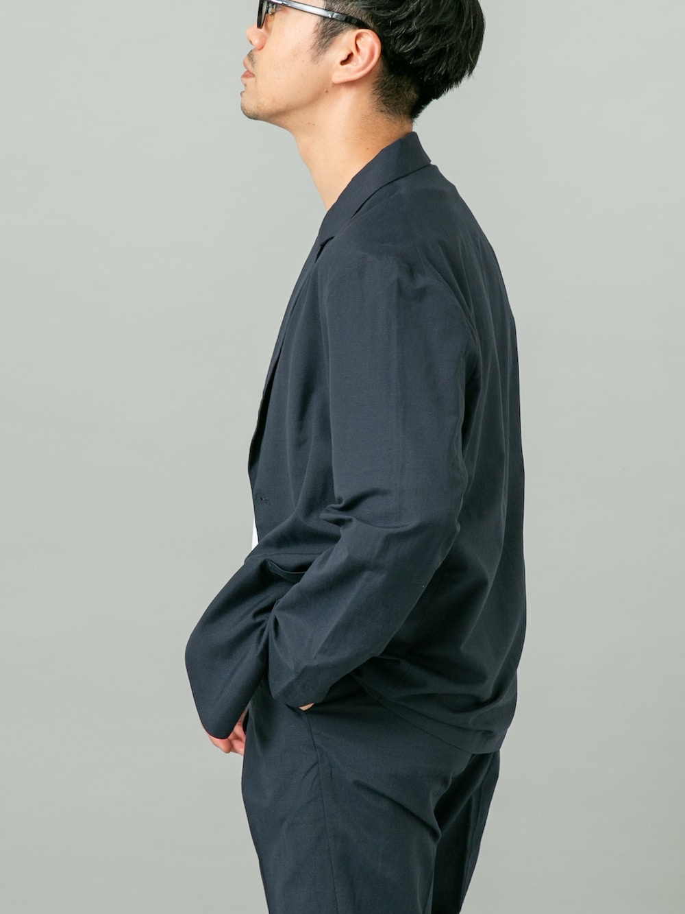 ジャケットは元々スッキリシルエットなのでLサイズでも大きくなりすぎず程よいゆとり感です。