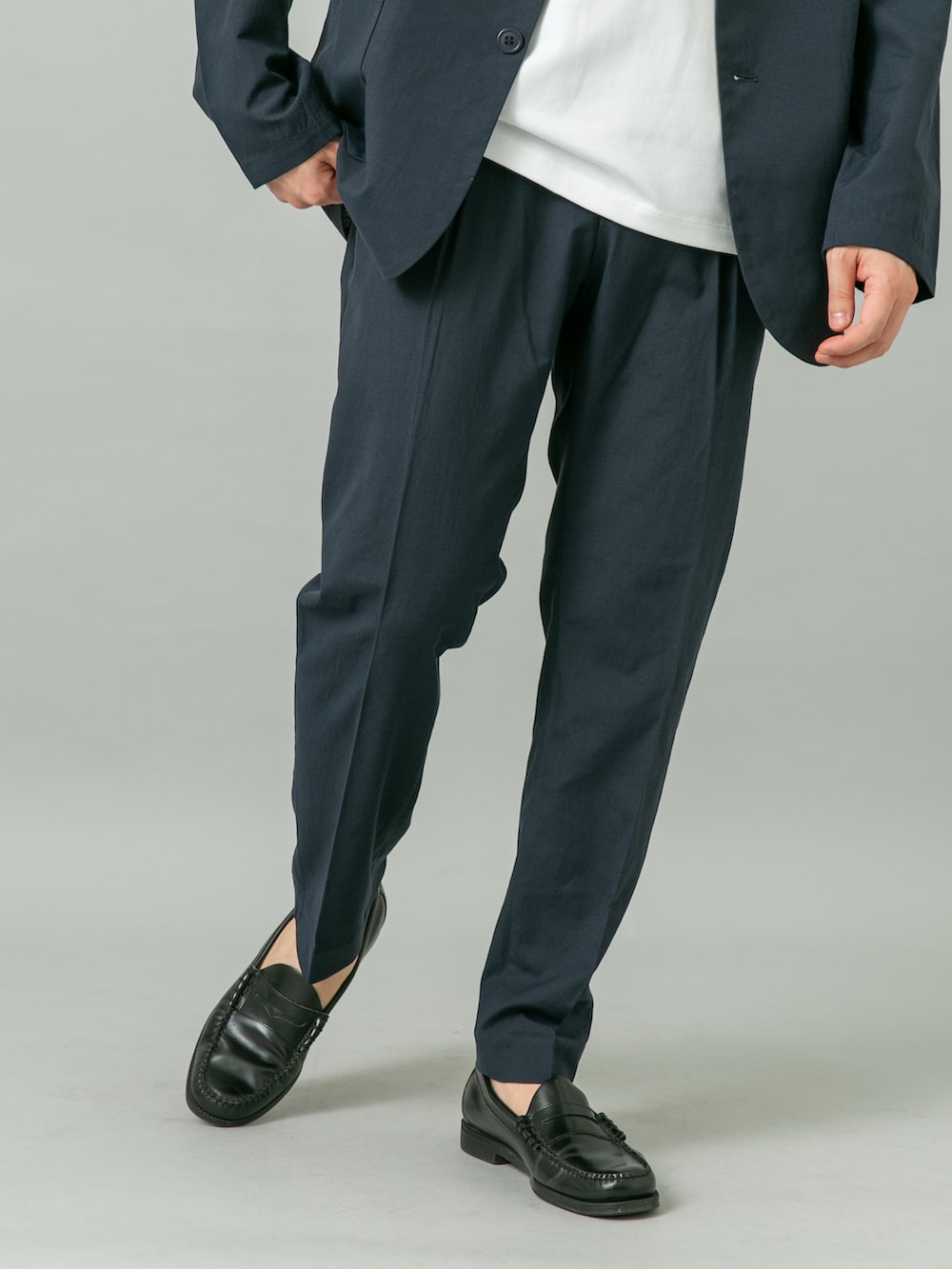 シワが気にならない機能性リネンを使用したセットアップに、コットン見えのひんやりTシャツと合わせました。