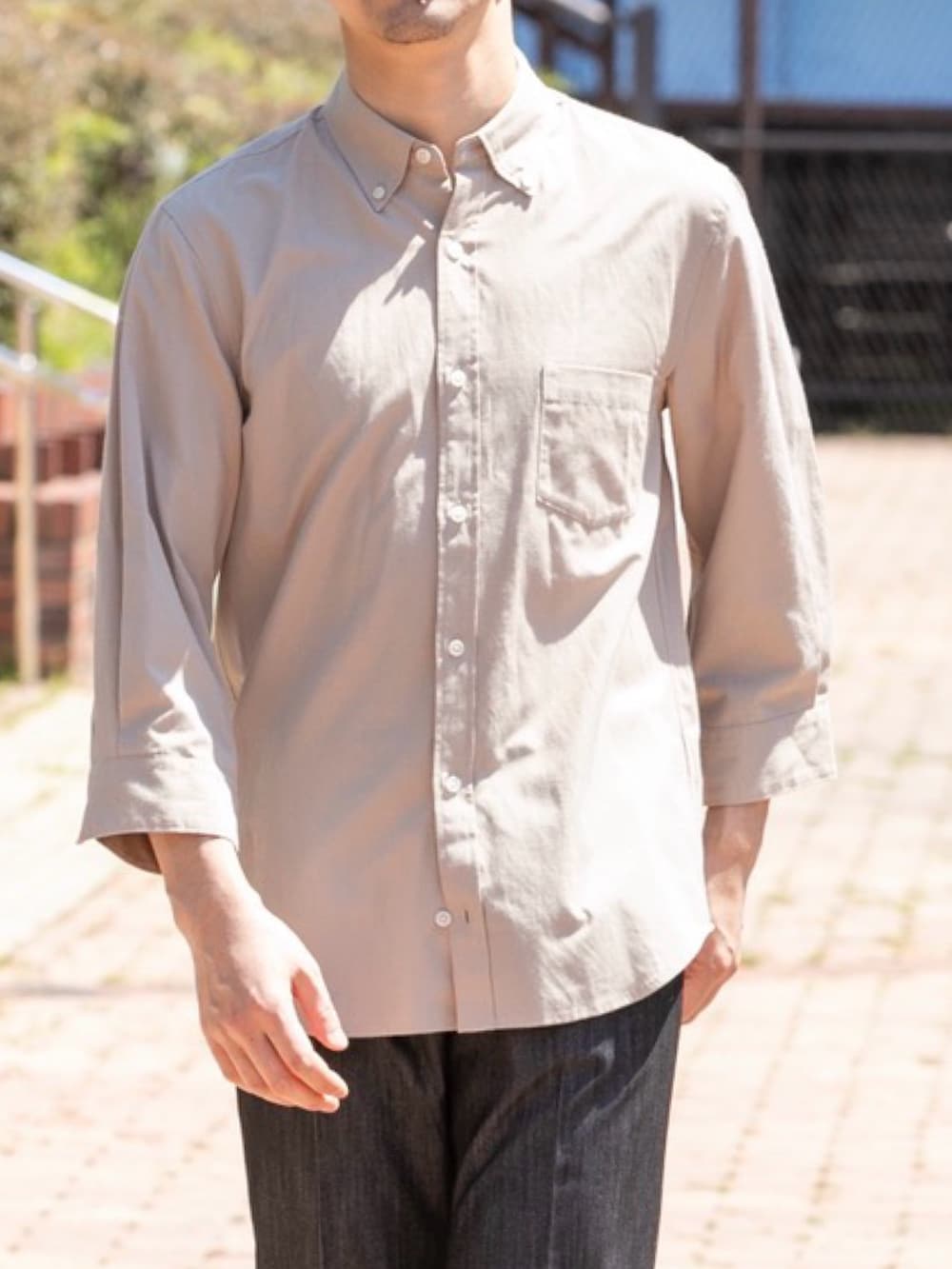 ひんやりとした夏用のデニムスラックスにシワが気にならない7分袖のリネンシャツを合わせた涼しいスタイル。