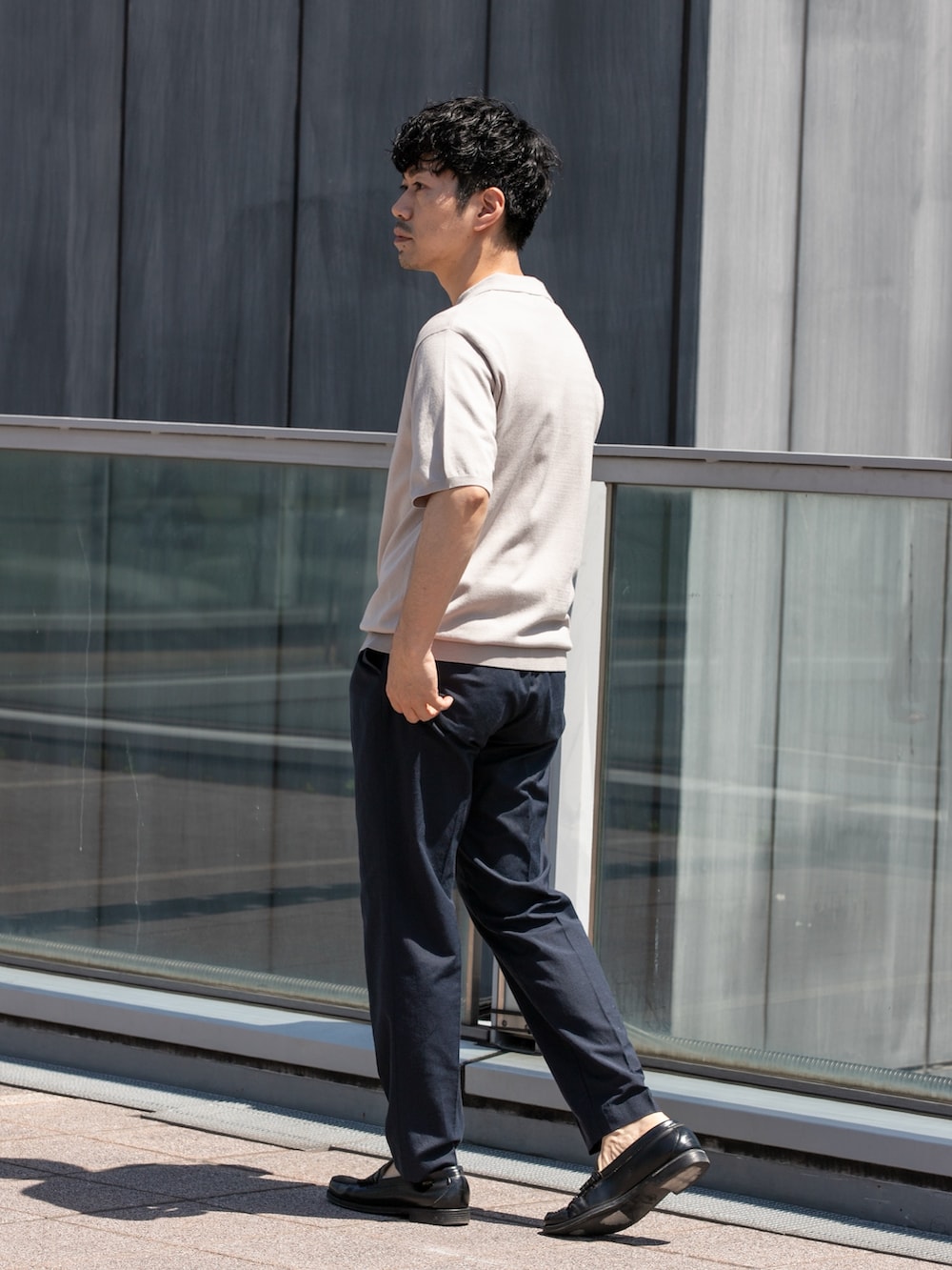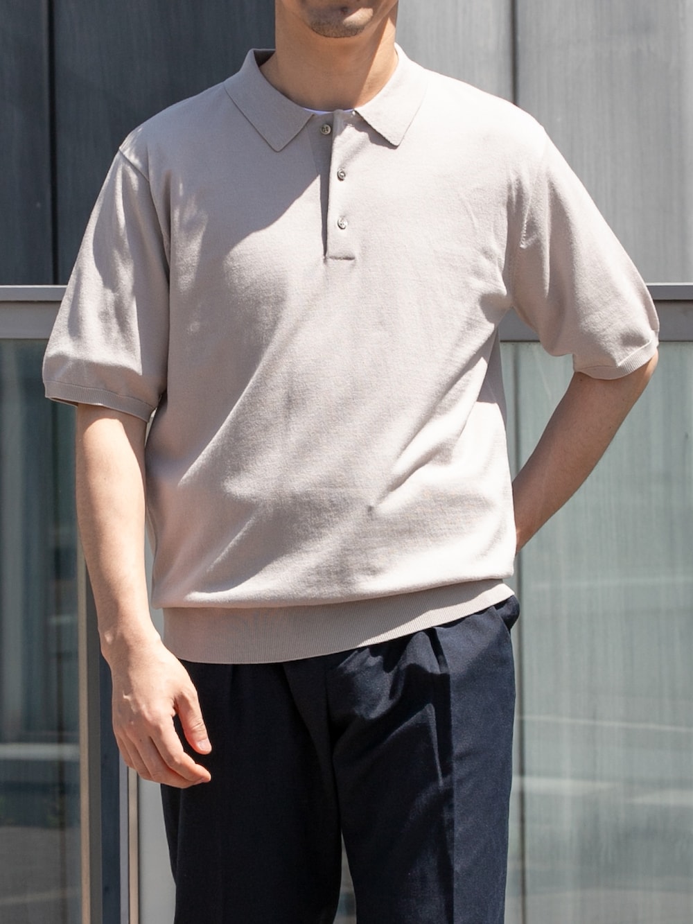 シルク混で着心地さらさらのニットポロにシワが気にならないリネンスラックスを合わしたビジカジスタイル。