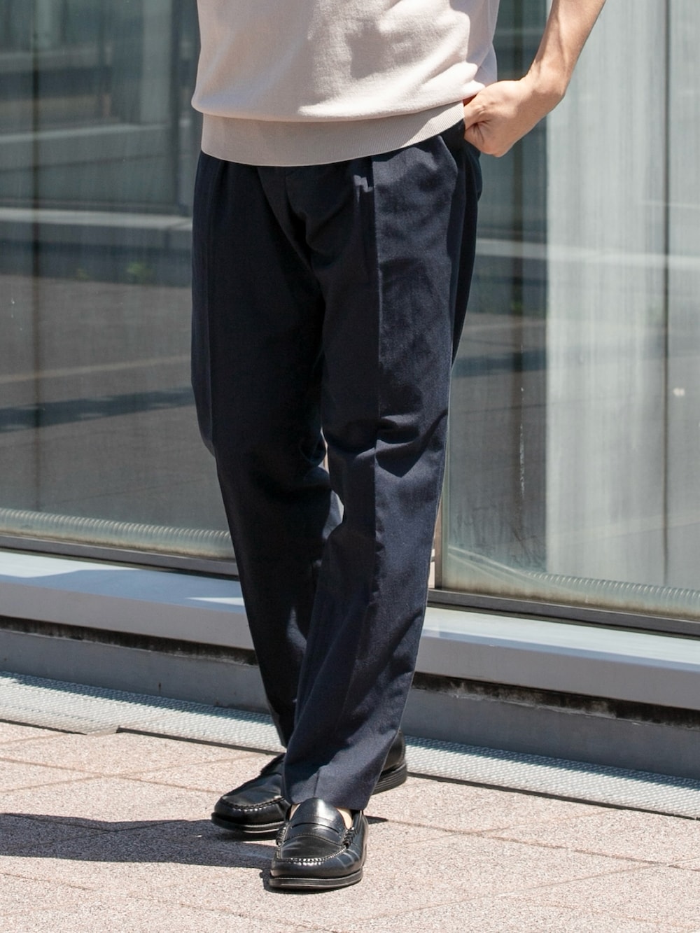 パンツはMサイズで着丈はローファーでクッションが入るか入らないかのちょうど良い長さです。