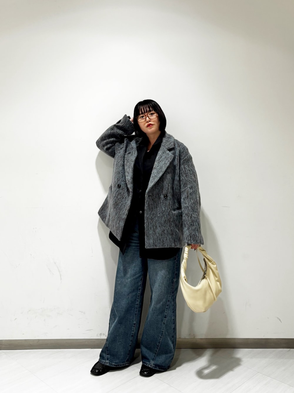 黒インナーで全体を引き締めつつ、アイボリーのバッグで柔らかさをプラス。