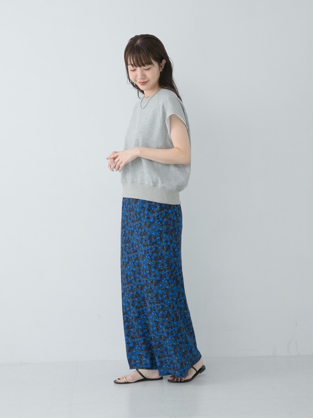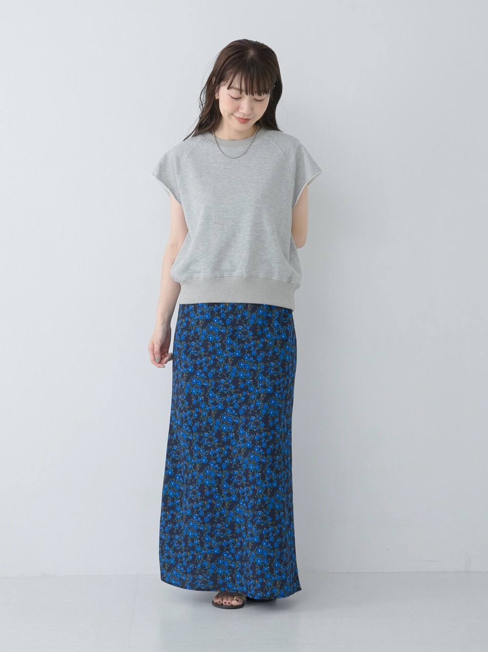 人気のスウェットに小花柄のスカートを合わせ