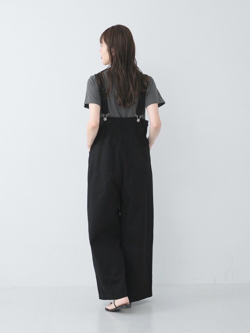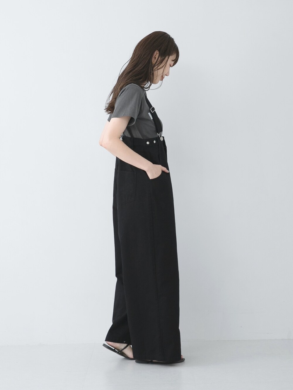 サロペットはウエストが胸下の位置にくる形で、