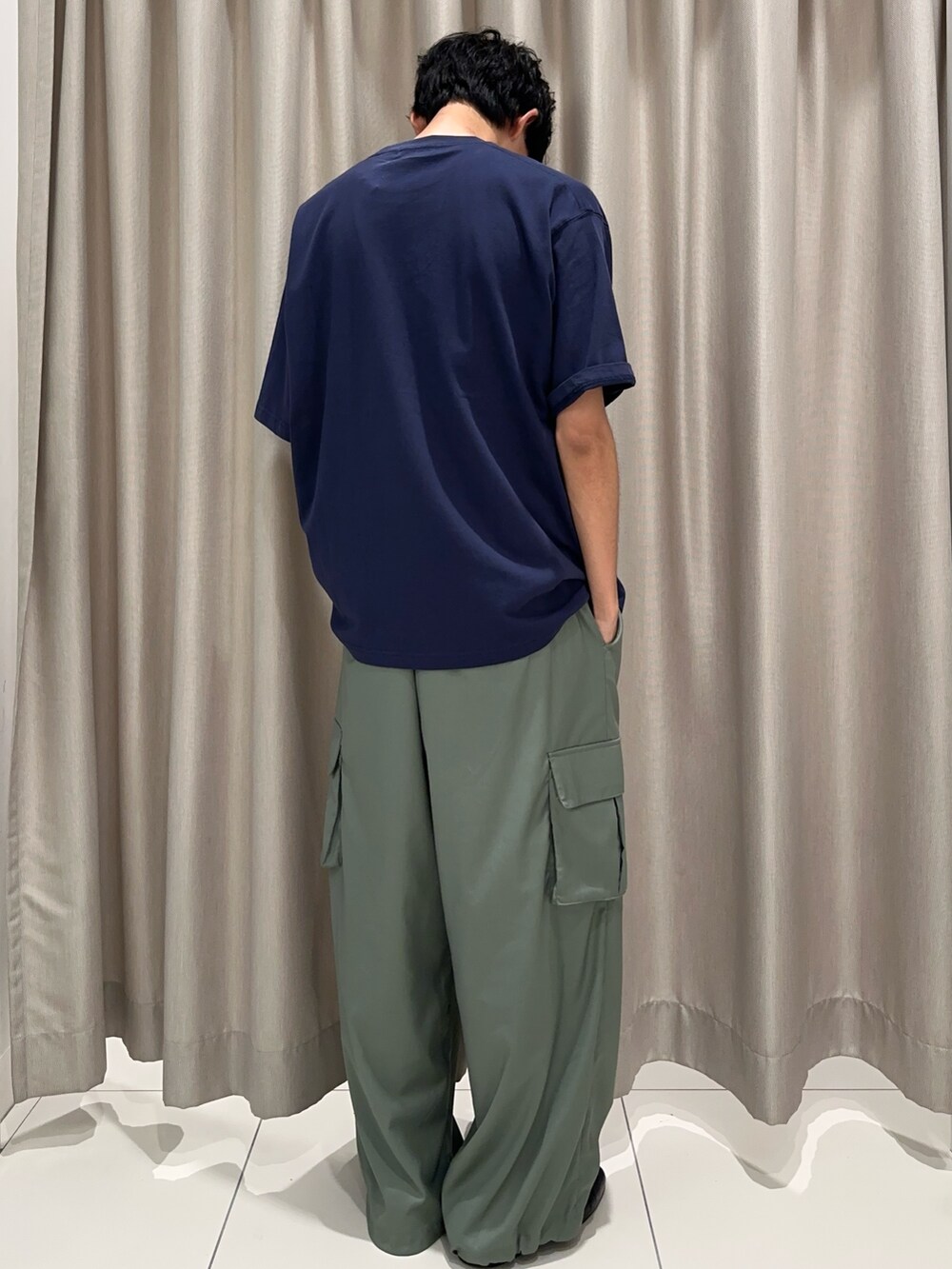 ネイビーのカットソーとグリーンのカーゴパンツを合わせたコーデです。