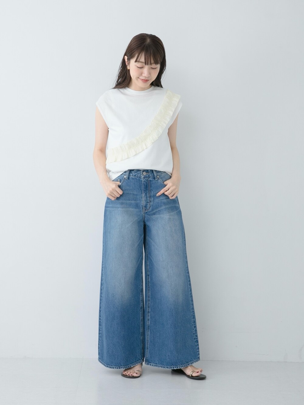 斜めに入ったフリルがポイントのTシャツは