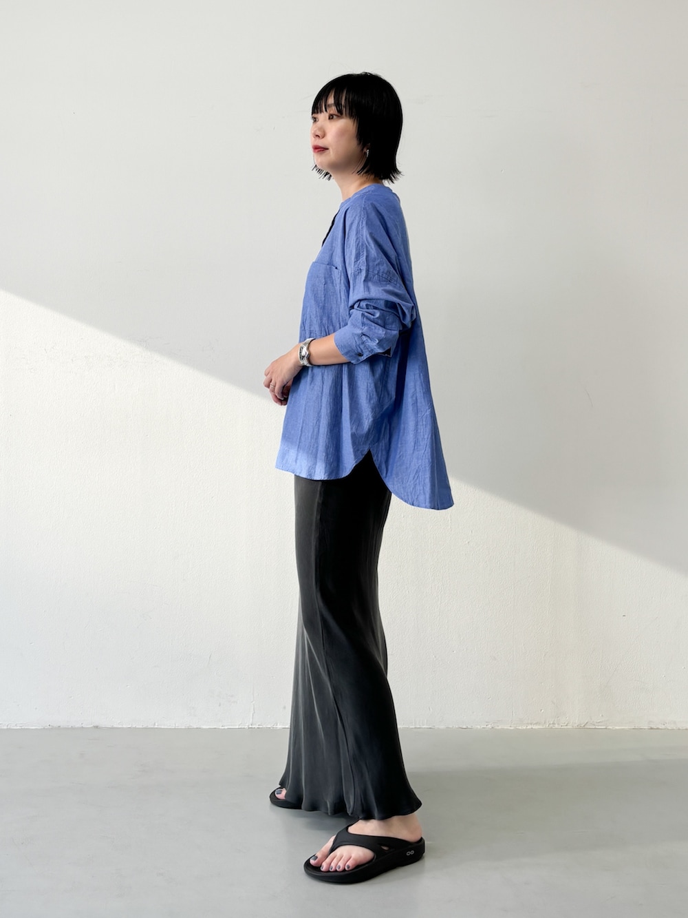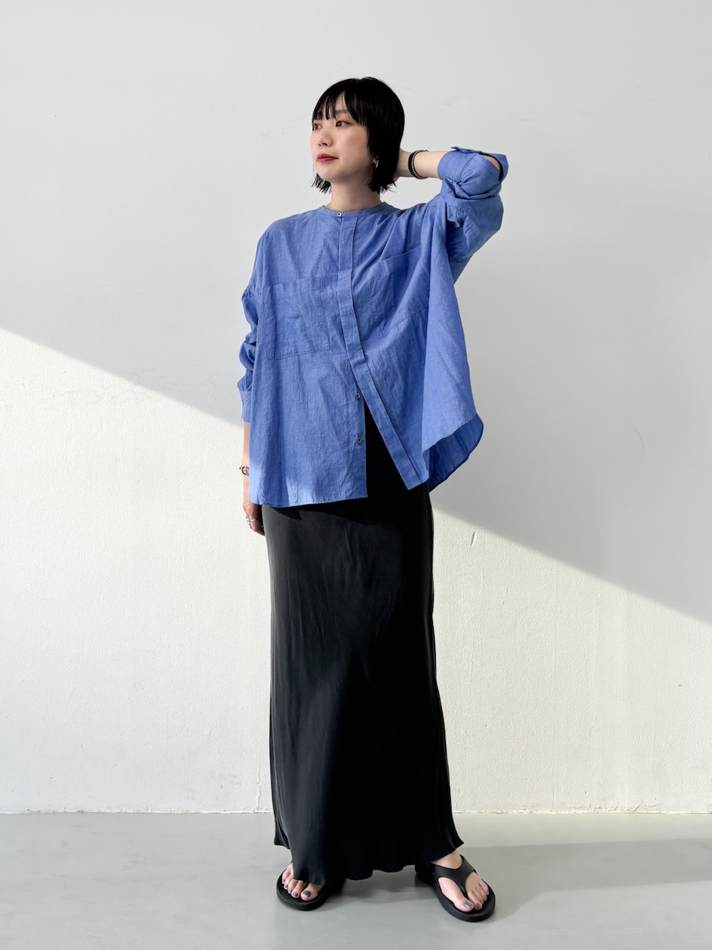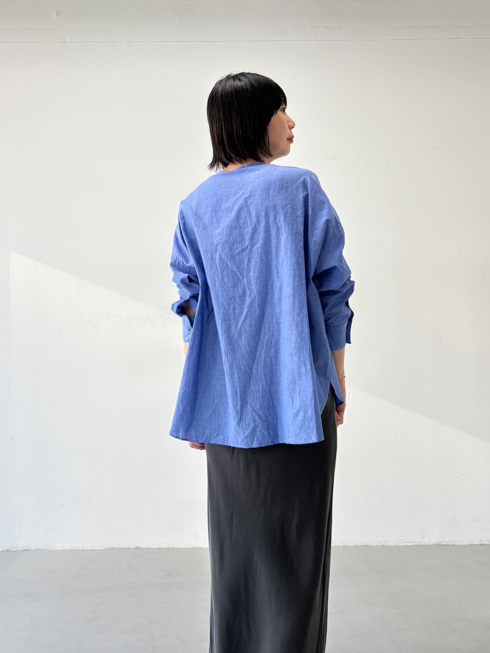 落ち感のあるスカートを合わせてナチュラルさを軽減しました。
