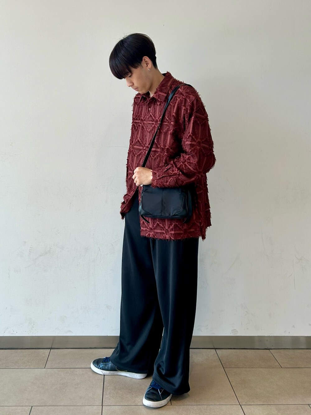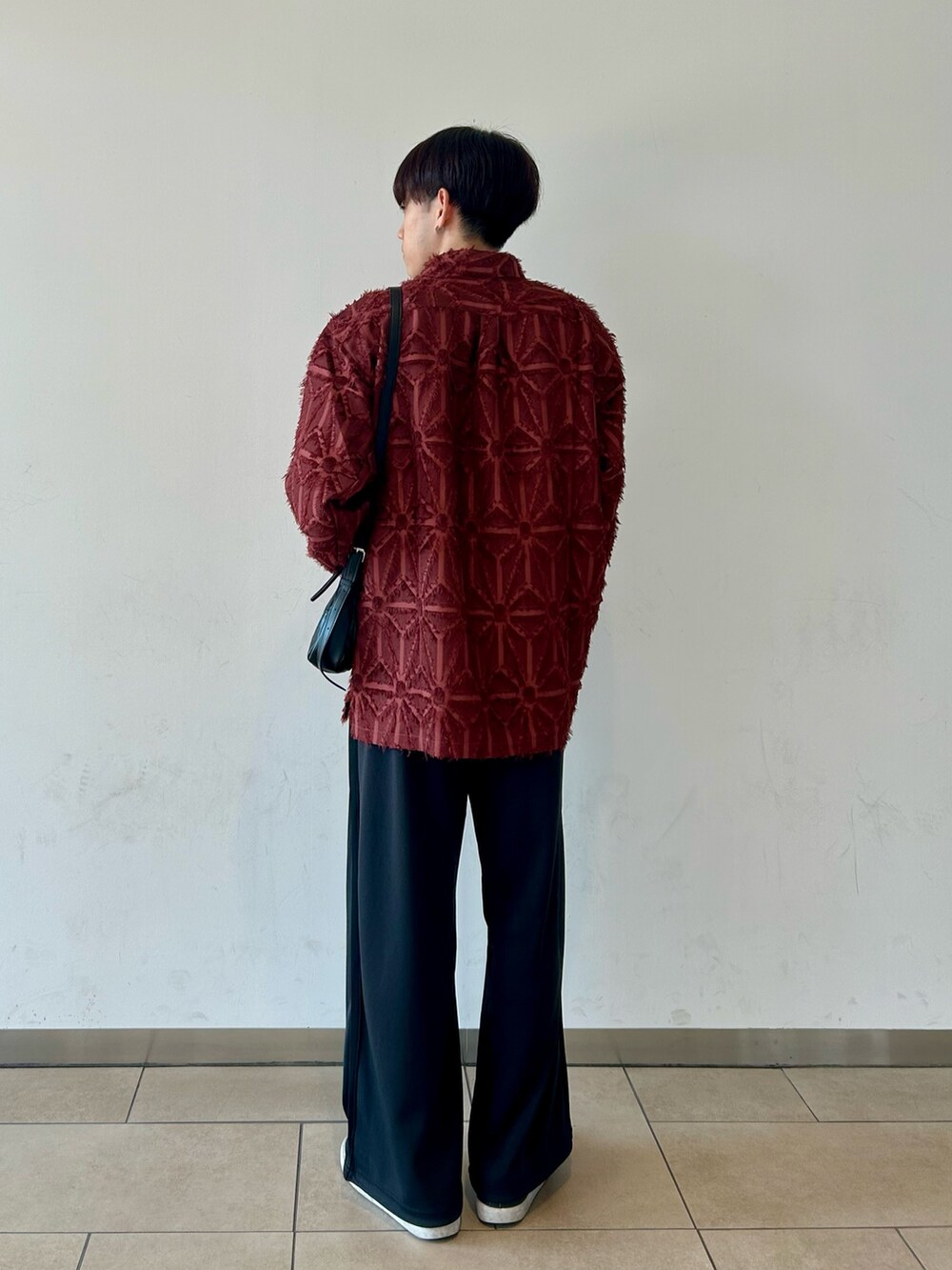 フリンジジャガードとデザインてんこ盛りなシャツは深みのある赤(コニャック)で秋のコーデにピッタリです🍁