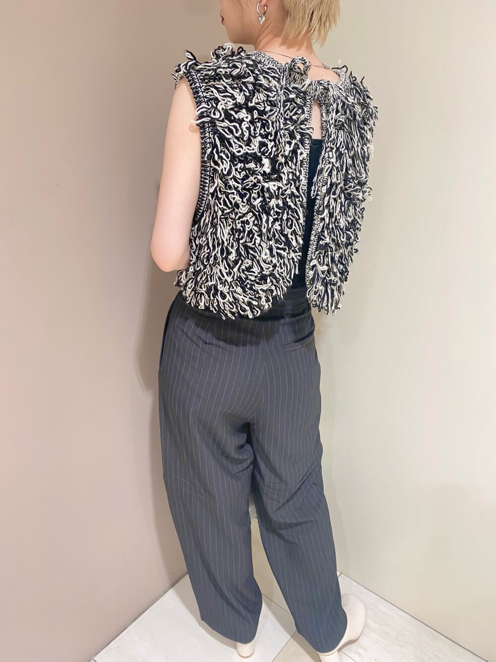 前後2WAY仕様のためインナーをキャミソールやタンクにすることでプルオーバーとして使えるループニットベスト。