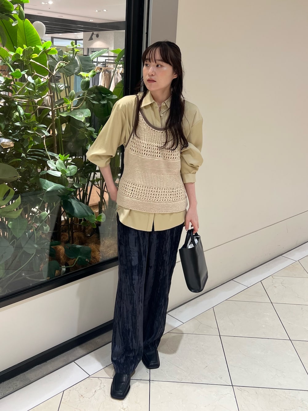 きれいめなサテンシャツに、ラフなベロアパンツを合わせてカジュアルミックスに!