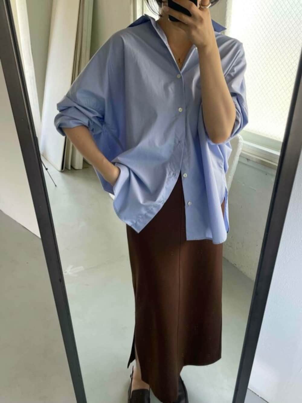 オーバーサイズのシャツをメインに、スッキリとしたタイトスカートを合わせて、メリハリのあるスタイリングを組みました。