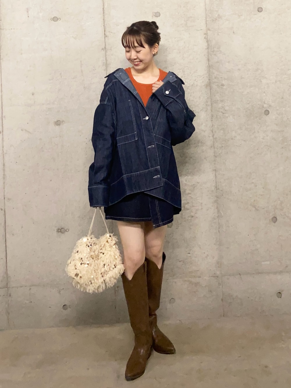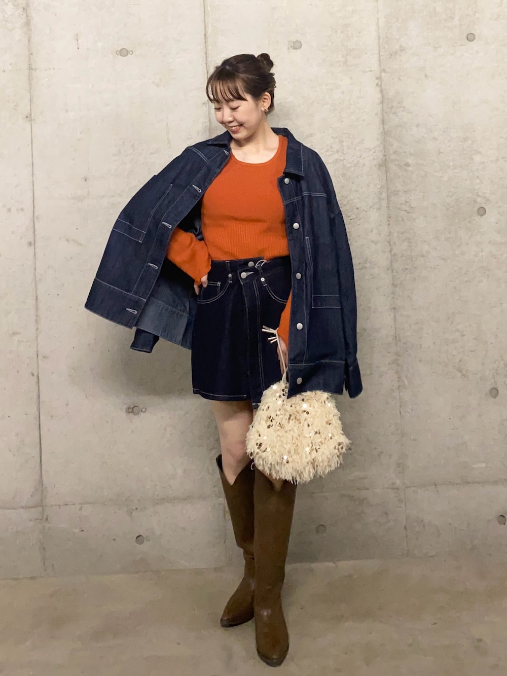 オレンジのニットは1枚でも着映えしますが、デニムと合わせたりインナーに取り入れるとめちゃかわです〜🥹✨️飽きが来ない最強万能アイテムです◎