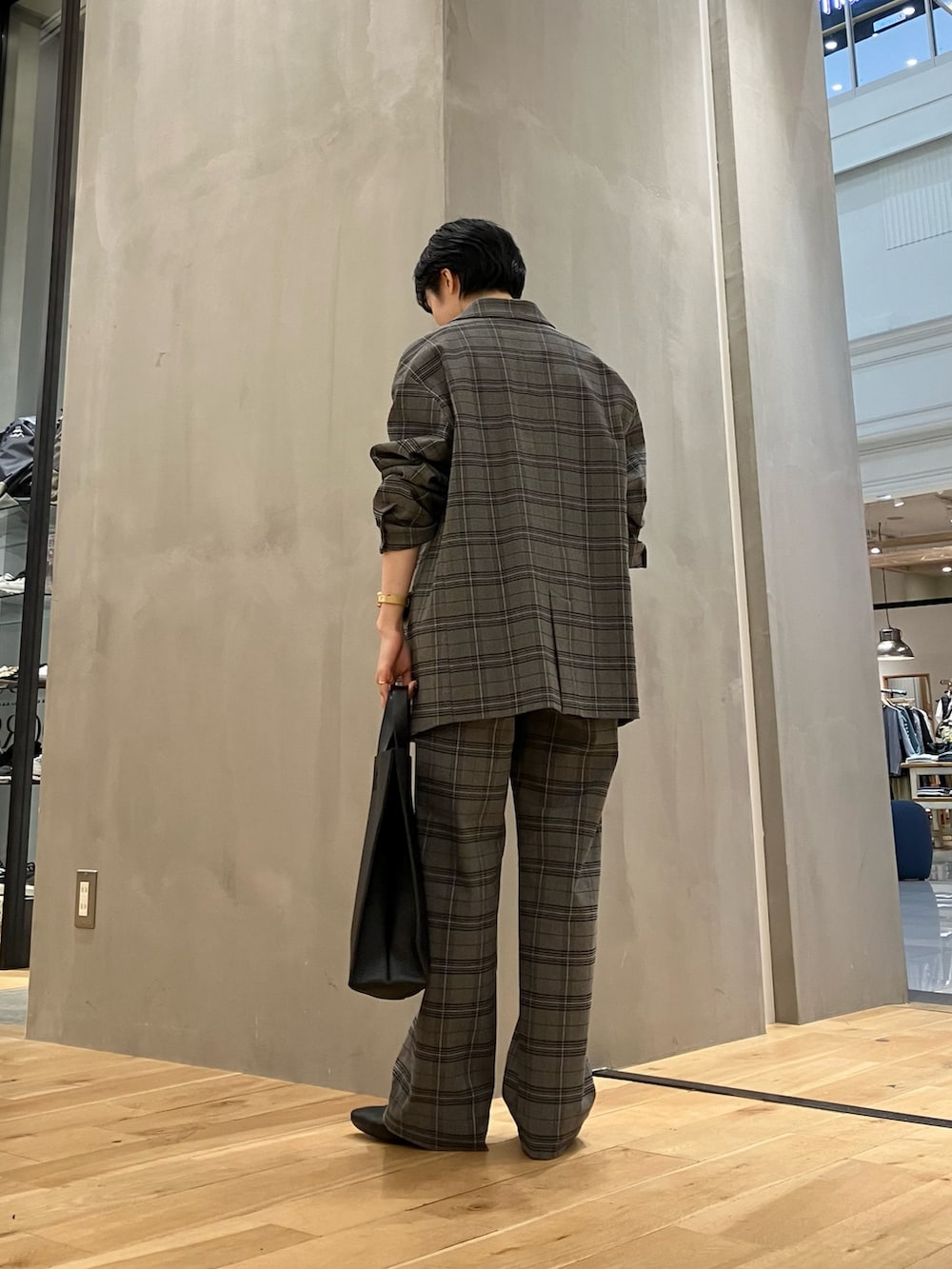 ジャケットはくびれはないストレートでゆったりめのシルエット、袖丈もしっかりあるので小柄な方は袖を上げて手首出していただけると少しすっきり着ていただけます。裏地もしっかりついているので今の30℃前後の気温だと暑いですが、これから~冬と春先も、インナーを変えて長く楽しんでいただけます◎