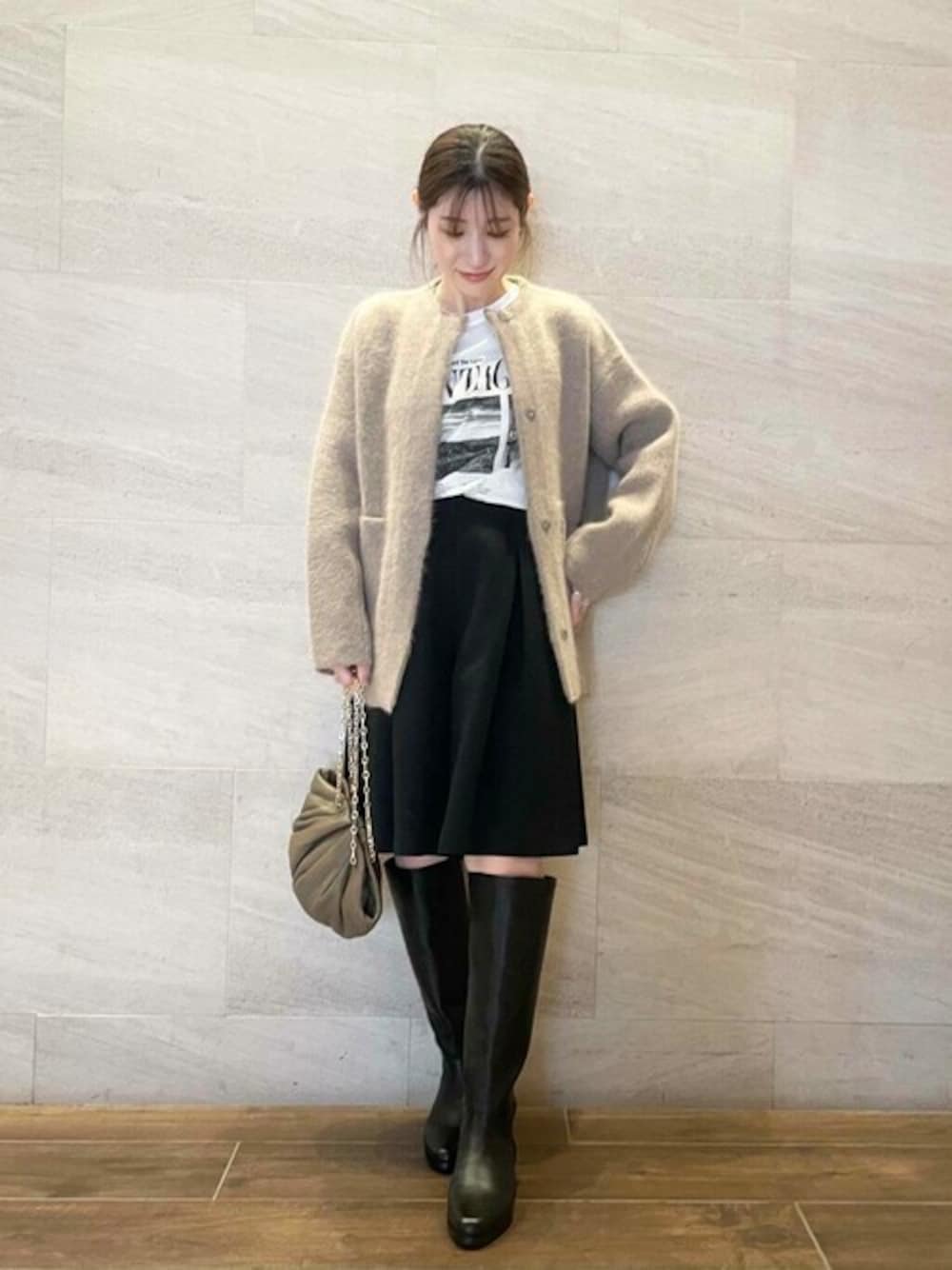 カーディガン以外はモノトーンで合わせて