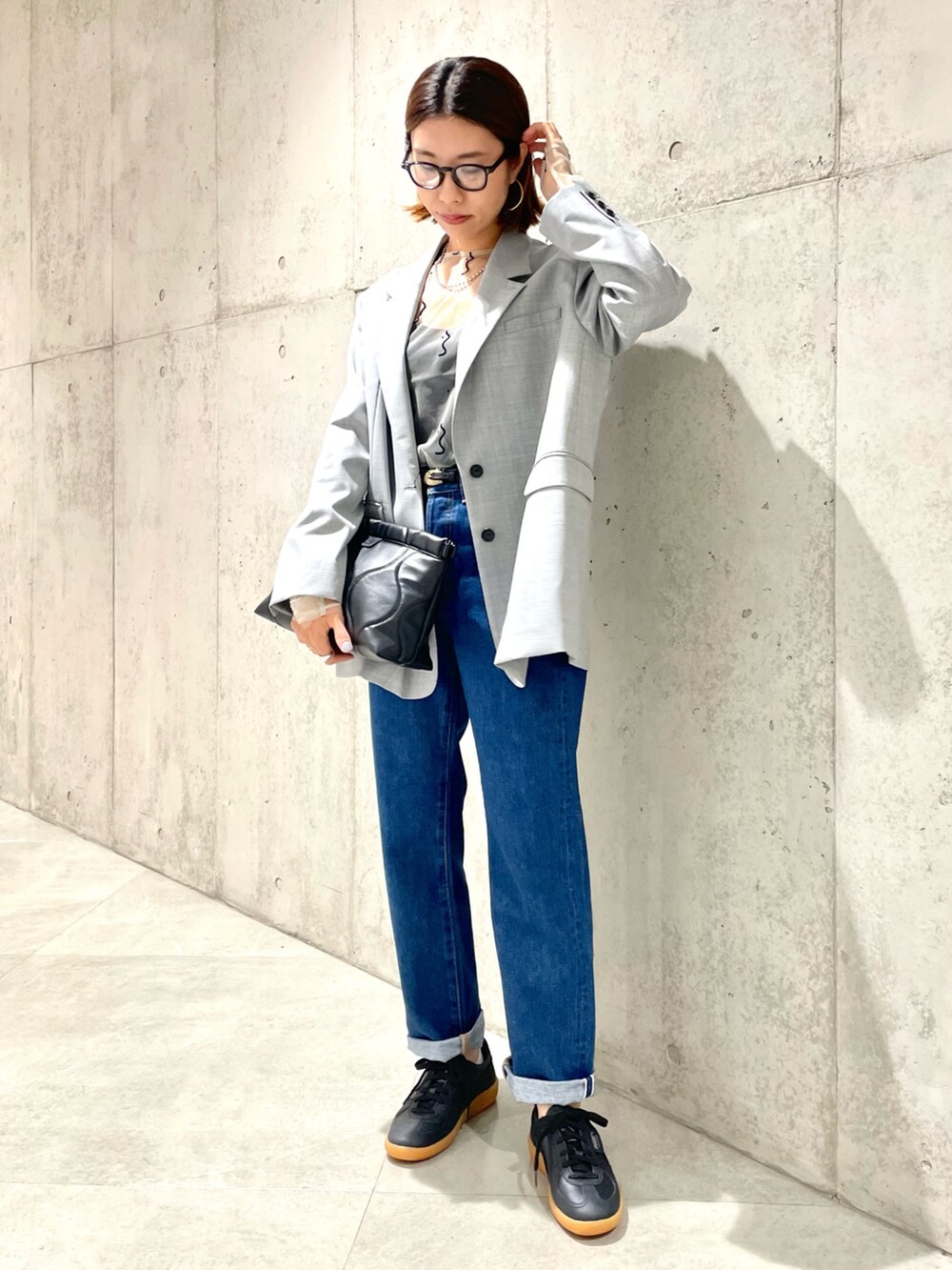 なみなみ模様がポイントのシアートップスにストレートデニムを合わせて、かっちりジャケットでマニッシュなスタイルです。
