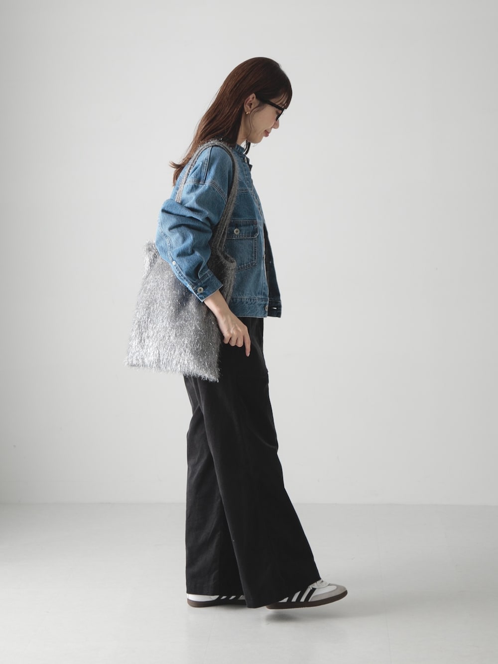 デニムジャケットはノーカラーデザインで