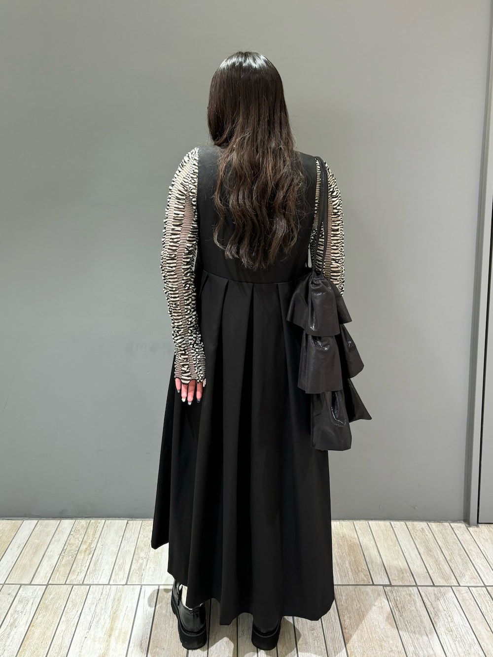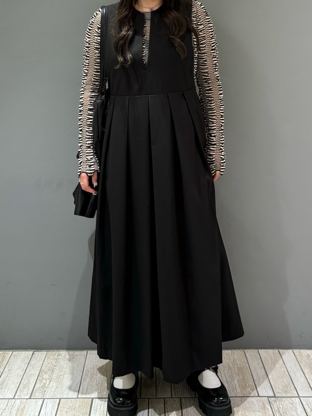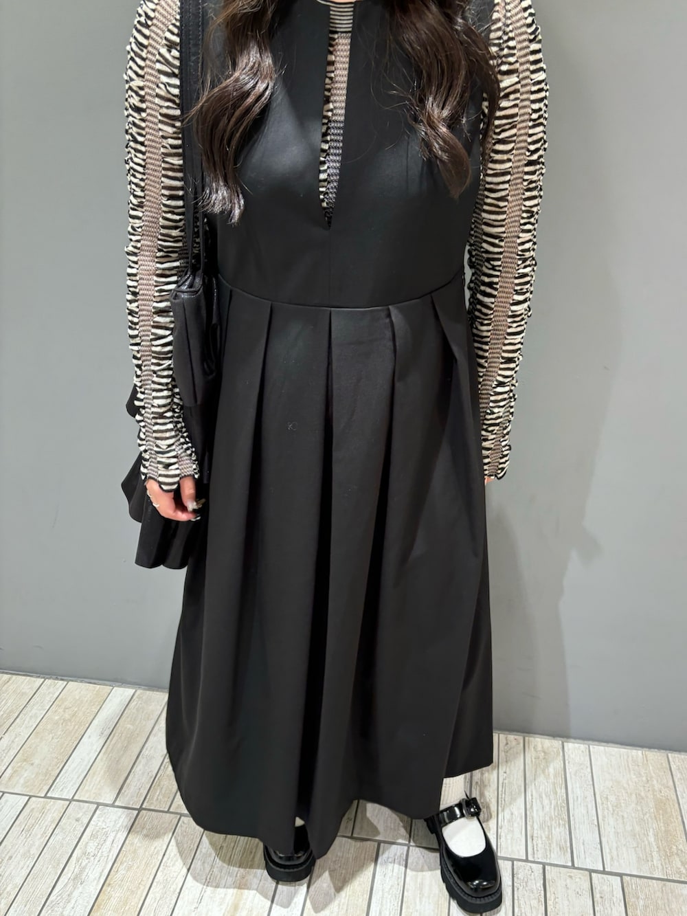 昨年も人気だったジャンパースカートが今年も再登場しております✊🏻前後2WAY仕様なのでその日の気分に合わせて、スッキリ大人っぽいキーネックとふんわりした丸い襟元で選んでいただけます!プリーツ部分も大きめのプリーツになっているので腰周りが広がる心配もありません🙅🏻♀️2サイズ展開になっているので低身長さんも高身長さんも問題なし!153センチの私は36を着用しましたが、くるぶしにかからない長さになっております👍🏻