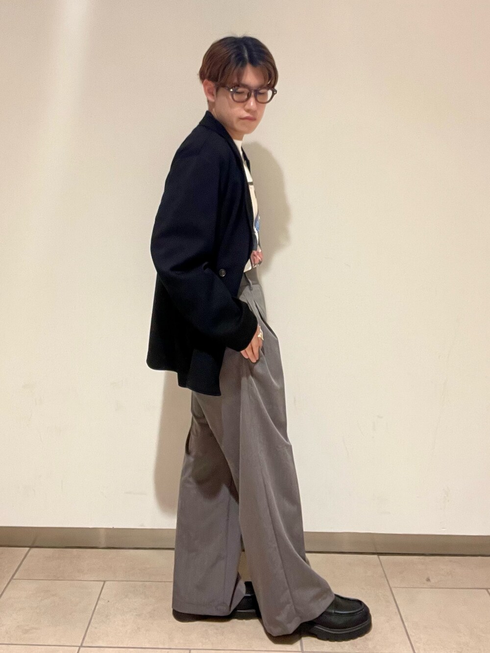 インナーにグラフィックTなどを入れてあげると印象が変わりキレイめカジュアルになるのでオススメです✨️