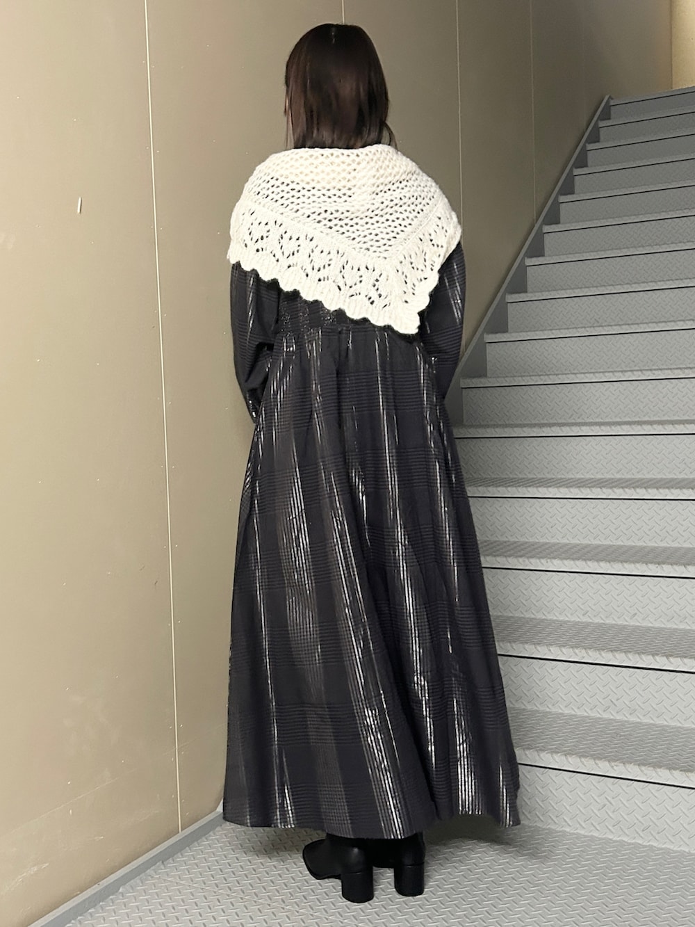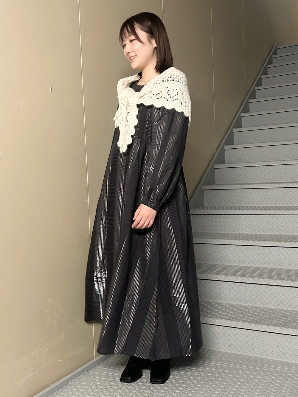 そのままだととても大人っぽい仕上がりですが、ニットストールを巻くことで可愛らしさがより引き立ちます❕
