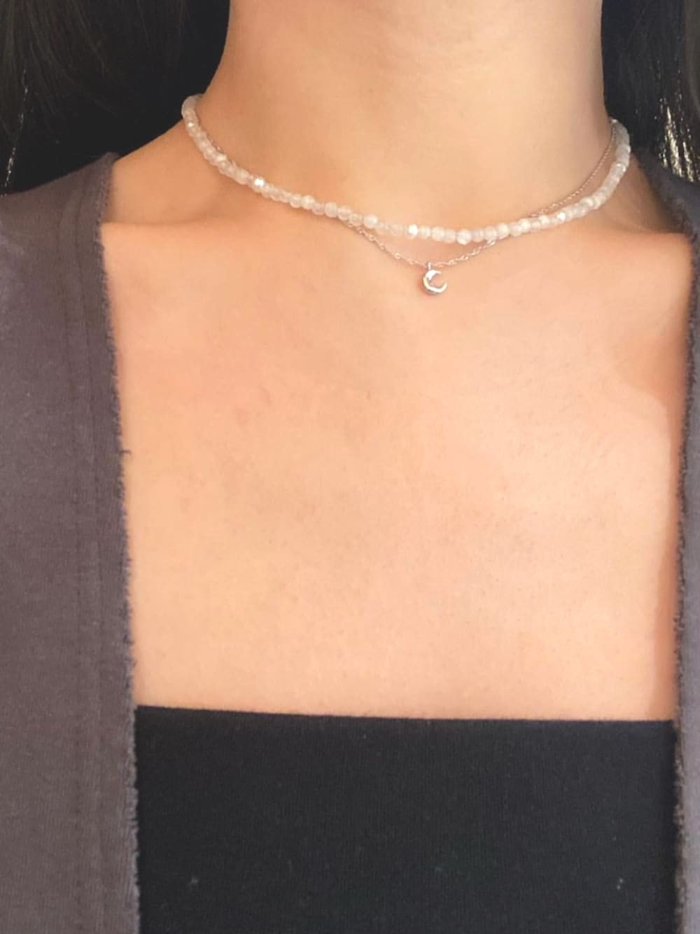 今回はムーンネックレスのホワイトゴールドと重ねづけで合わせてみました。(ムーンネックレスは短くして合わせました)