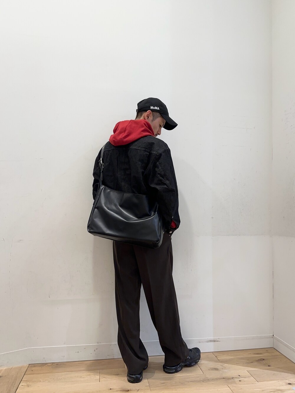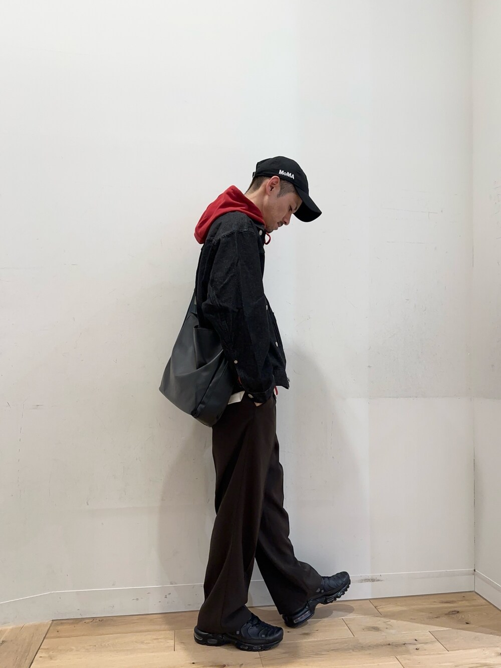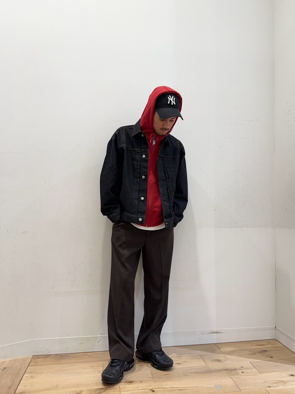 デニムジャケットからフードを出して