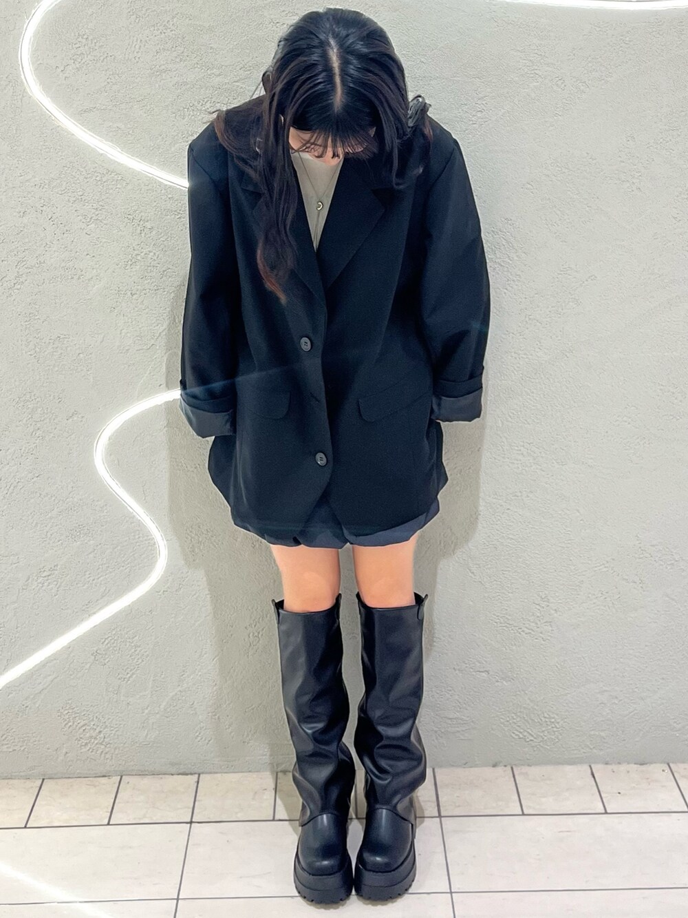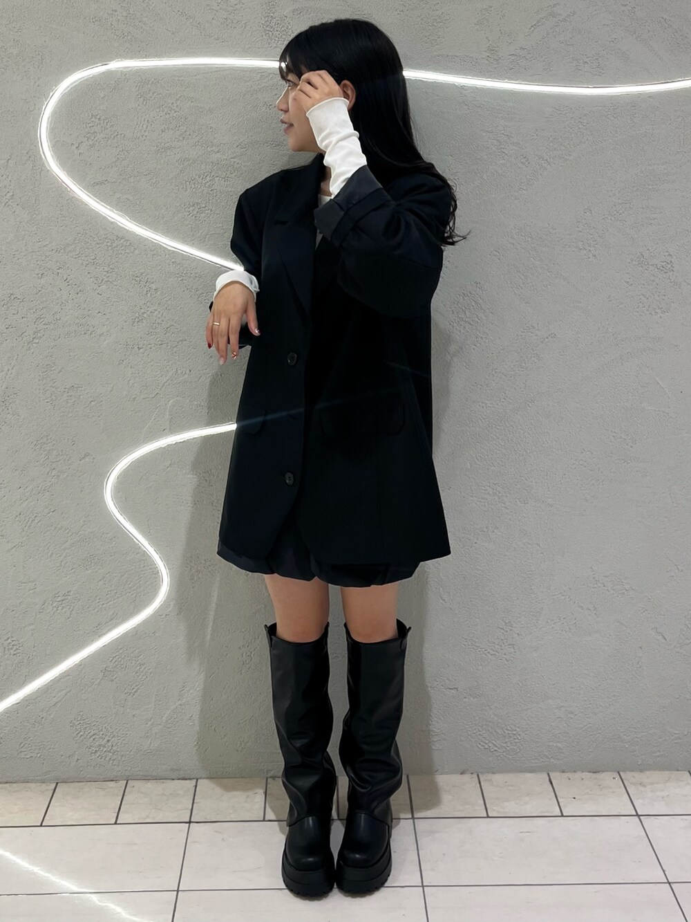 デザインのあるロングブーツはショート丈のパンツやスカートに合わせるととてもかわいいです🎀ジャケットはオーバーサイズで丈感がかわいい✨