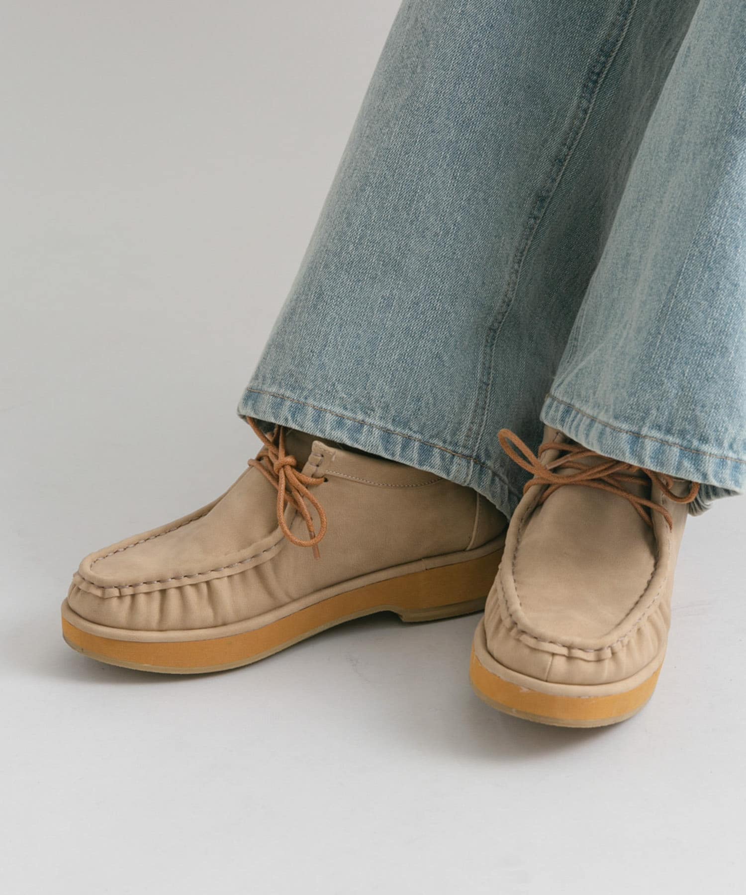 シンプルなニットとデニムの合わせに淡いブルーのアウターが映えるコーデです🌐