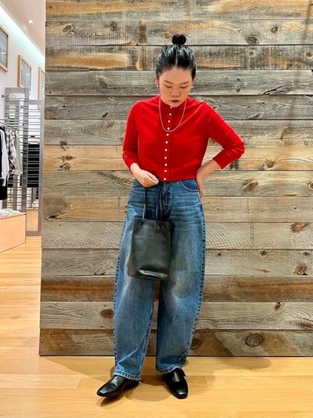 ボトムには、お洒落なシルエットがポイントのデニムを合わせてみました!