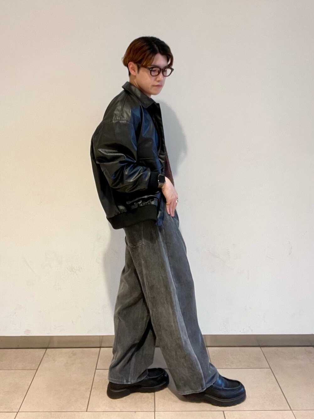 フェイクレザーブルゾンはデニムやきれいめなワイドパンツやカーゴパンツなど幅広いパンツと相性がいいのでオススメです!
