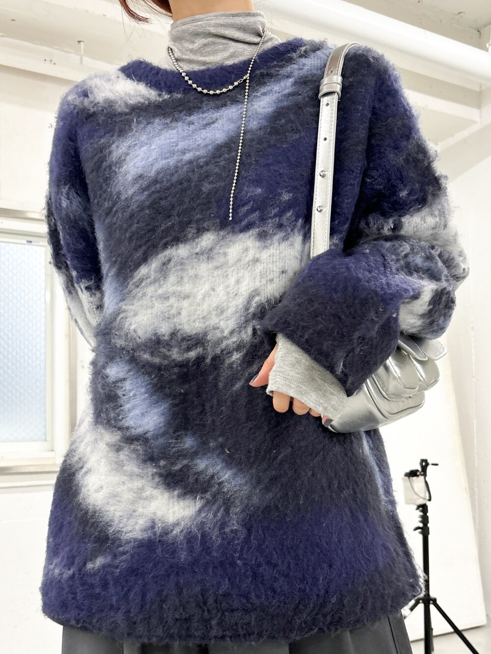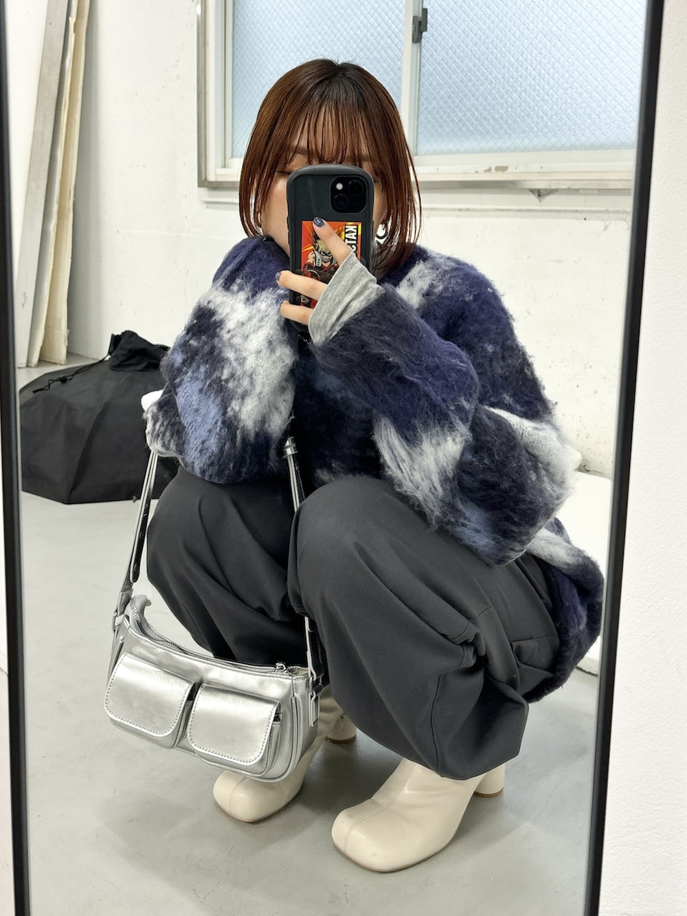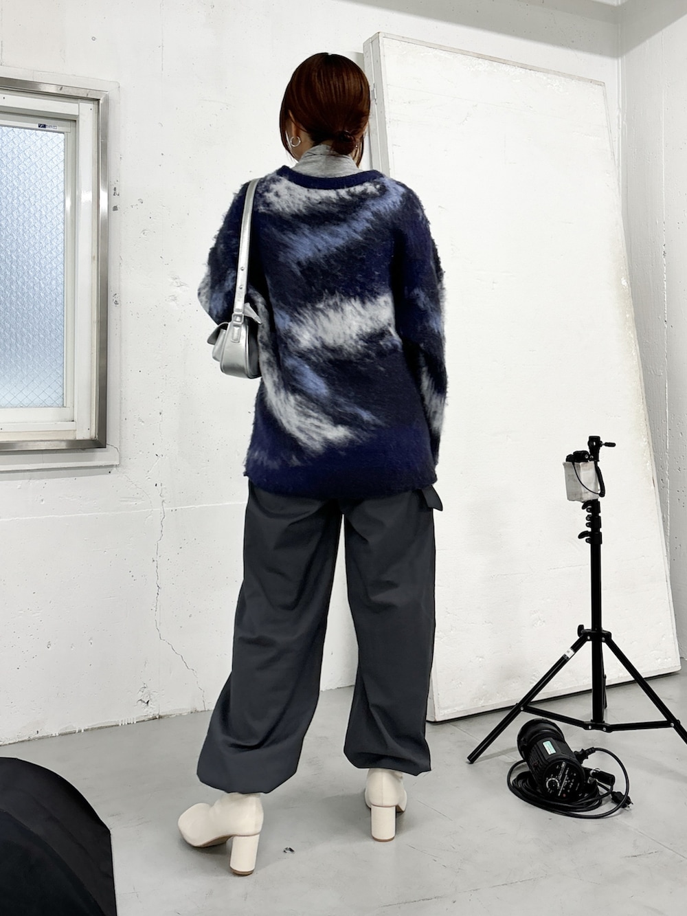 無彩色系のアイテムと合わせてニットが目立つように〇