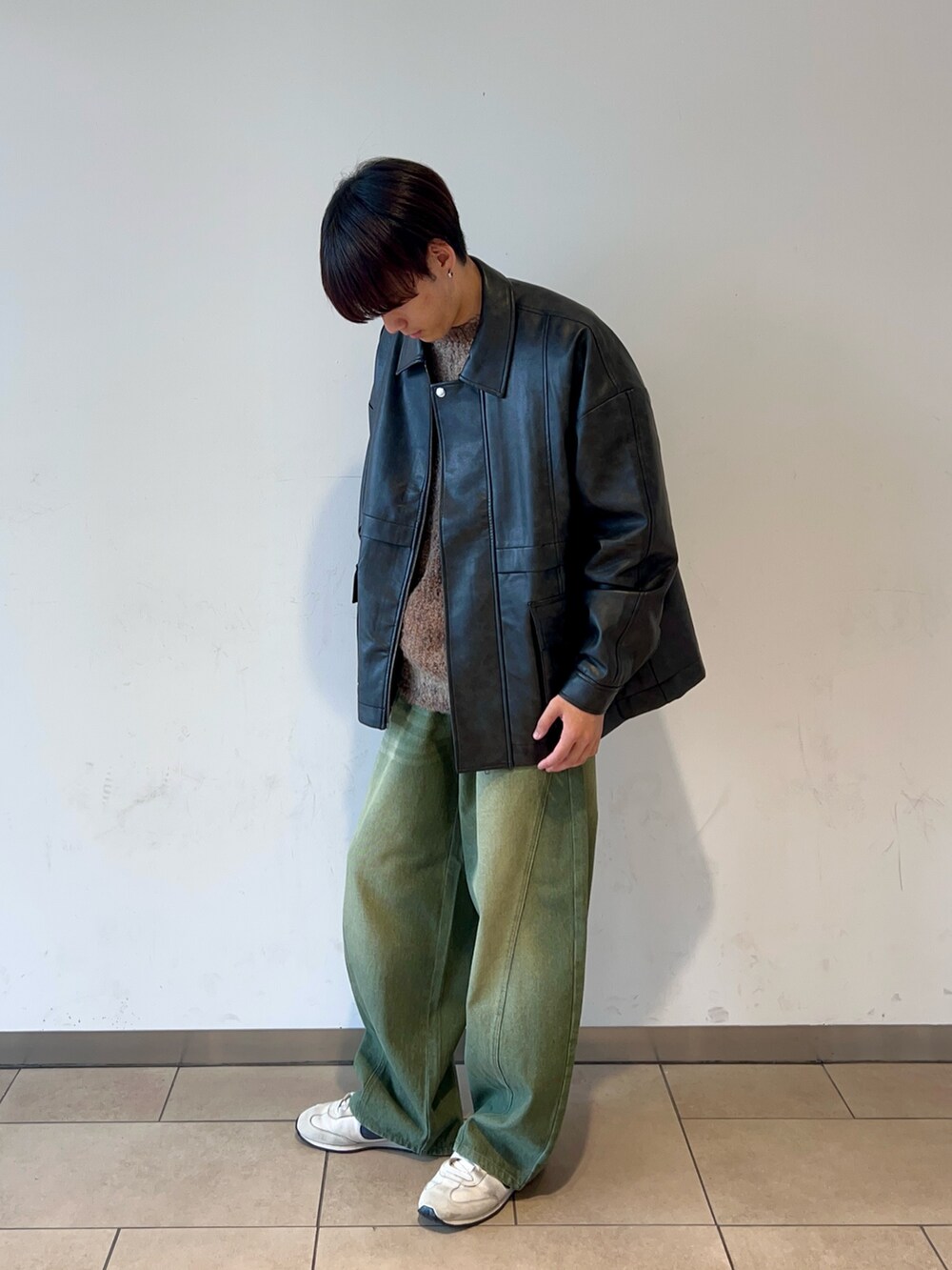 レザージャケットはレディース商品ですが、メンズが着ても程よい大きさになっております!