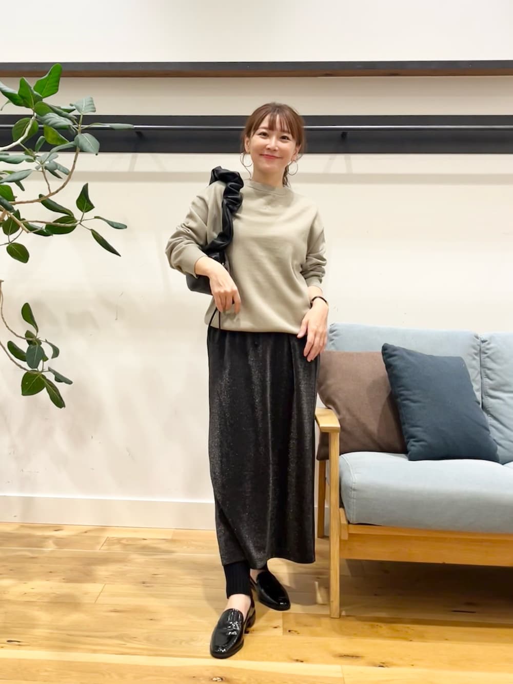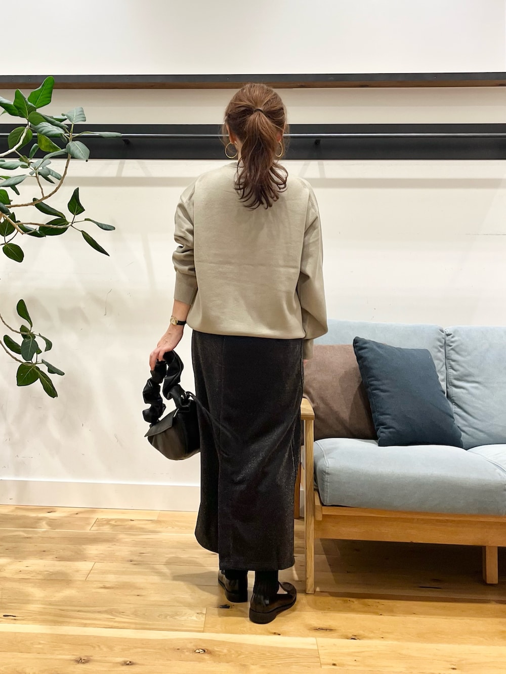合わせてるのは履き心地楽々なラメカットストレートスカート。
