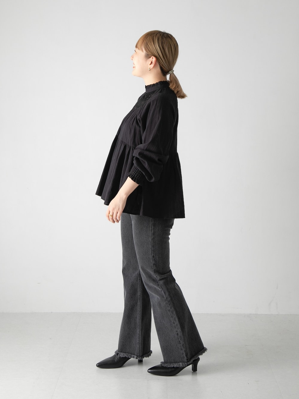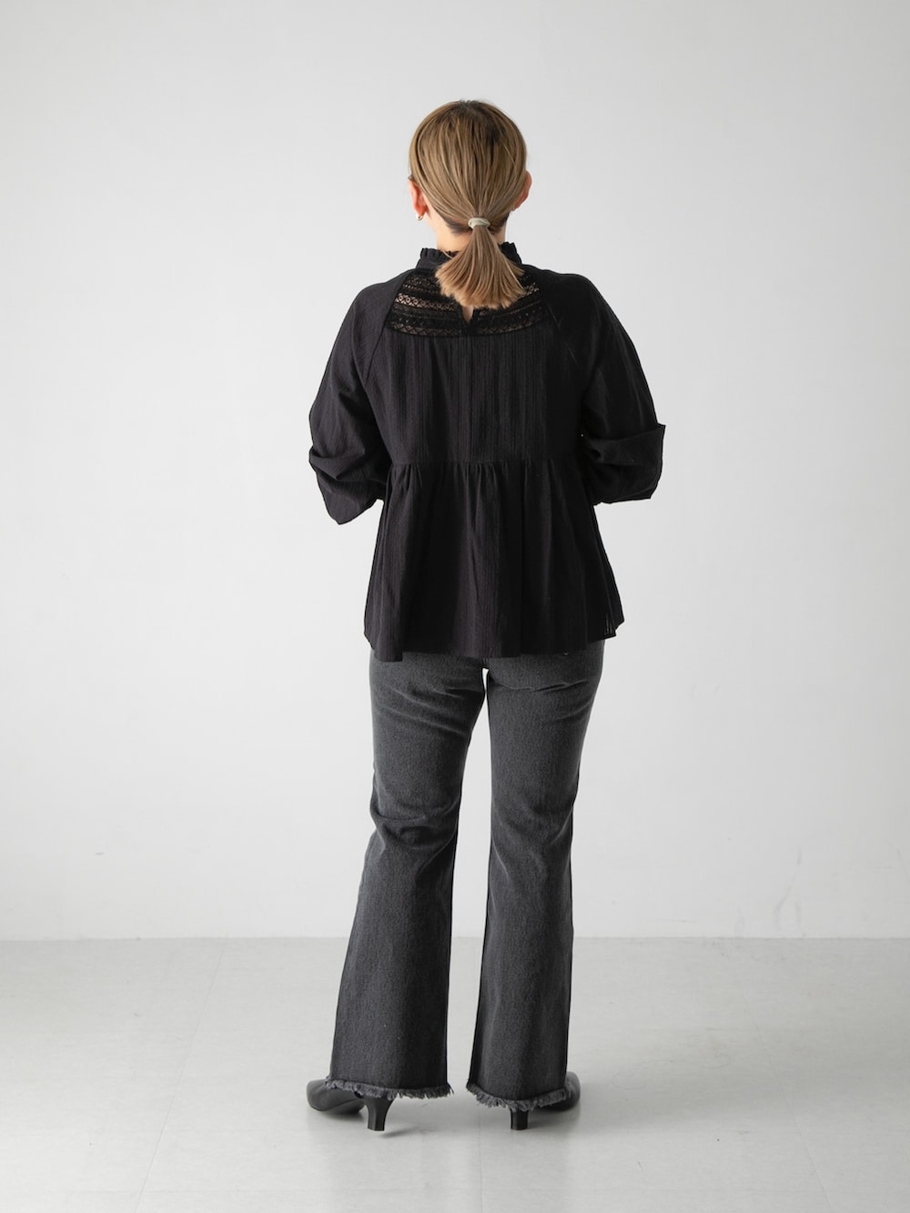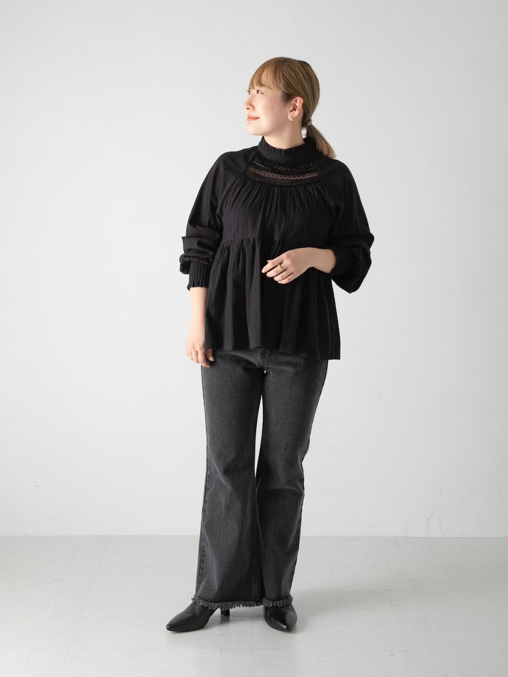 レースのブラウスはブラックを選ぶことで甘さ控えめに!