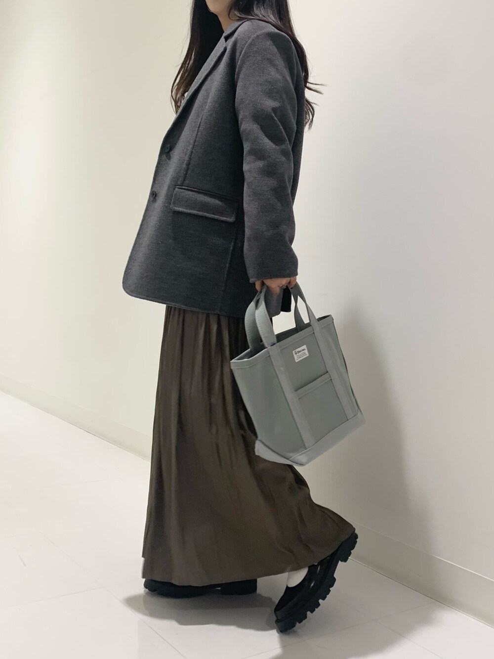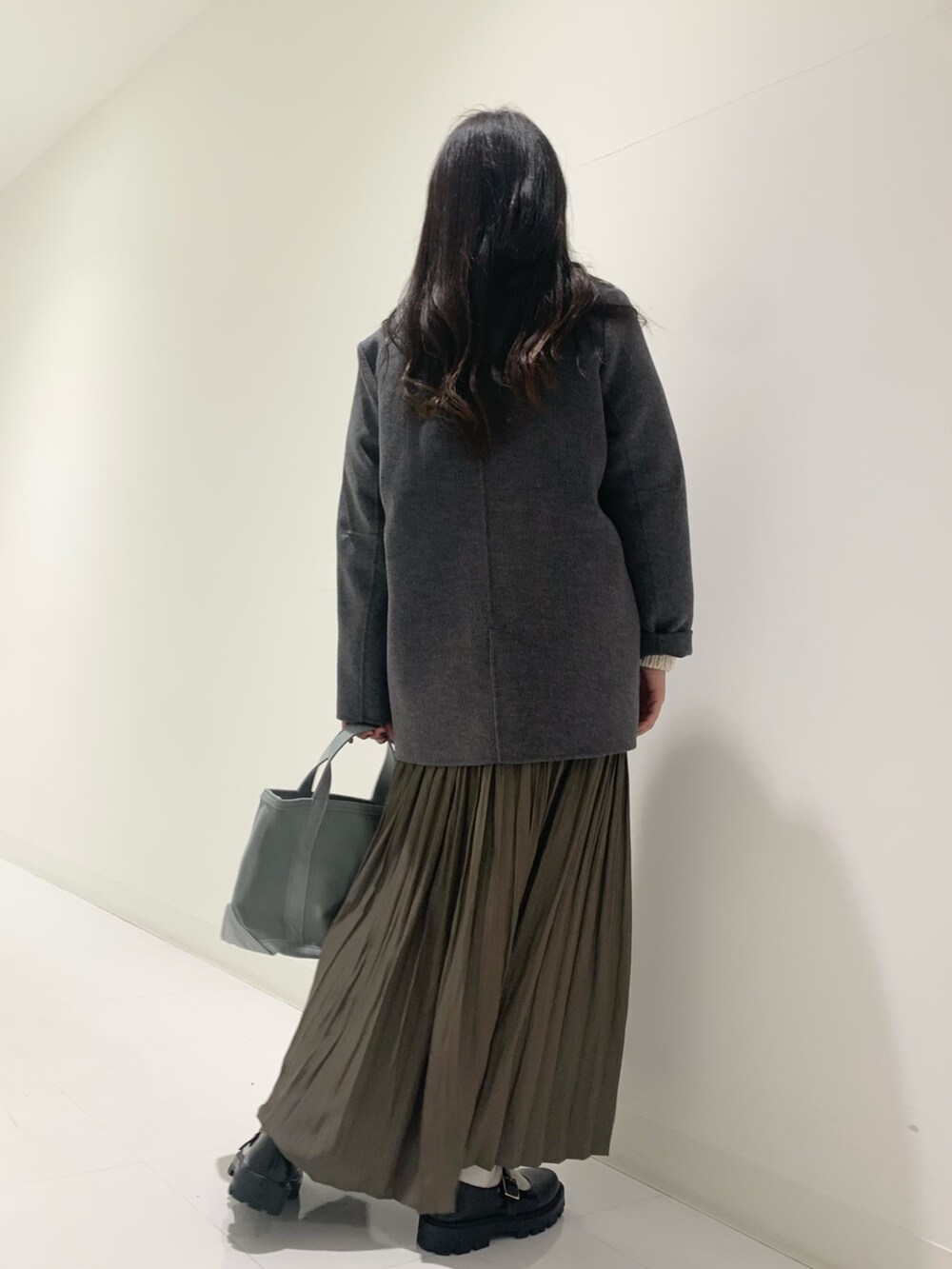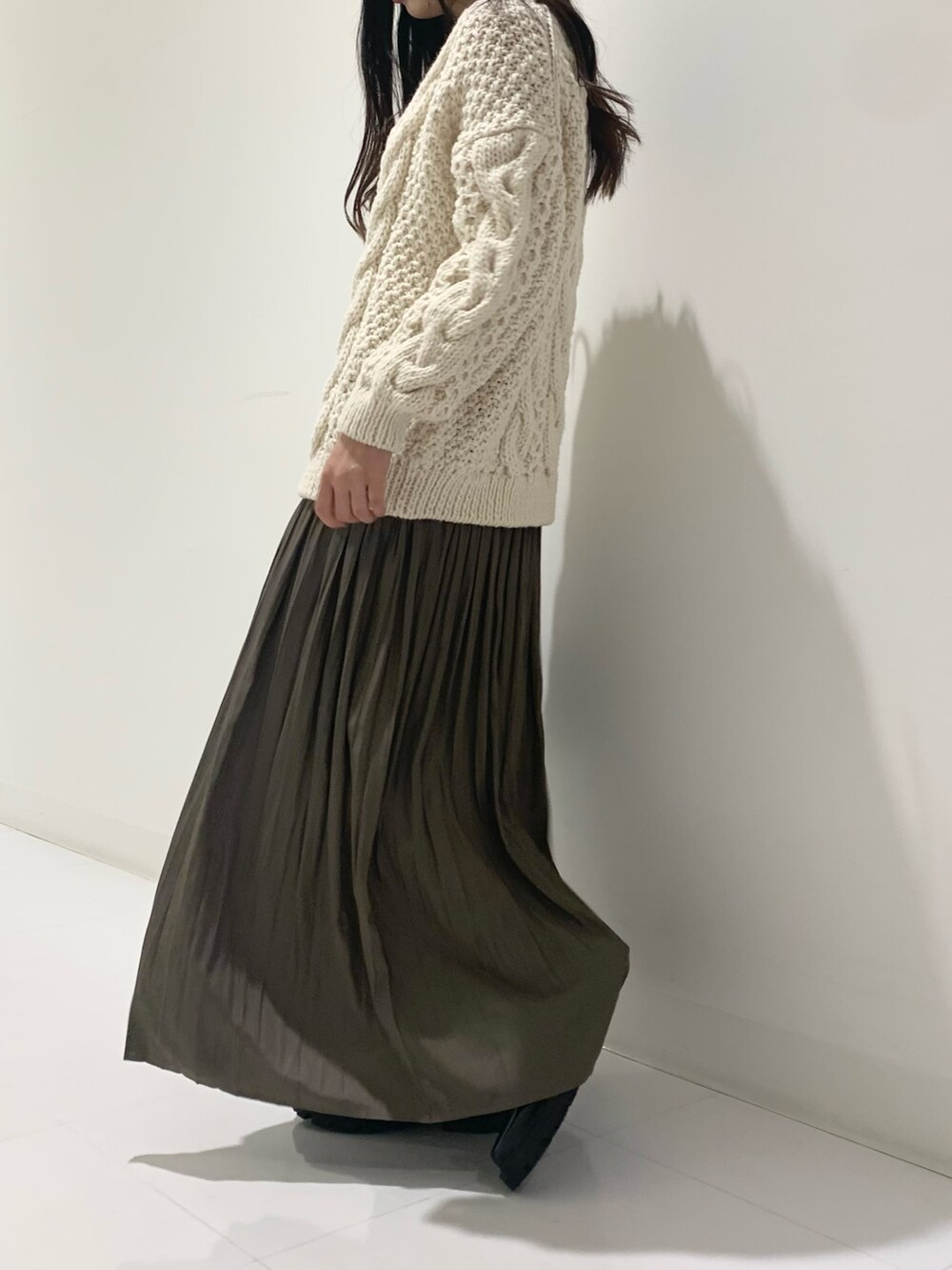 ロングスカートが好きな身長165㎝の私には少し短めに感じましたので今回のコーディネートでは腰より少し下で履いています。