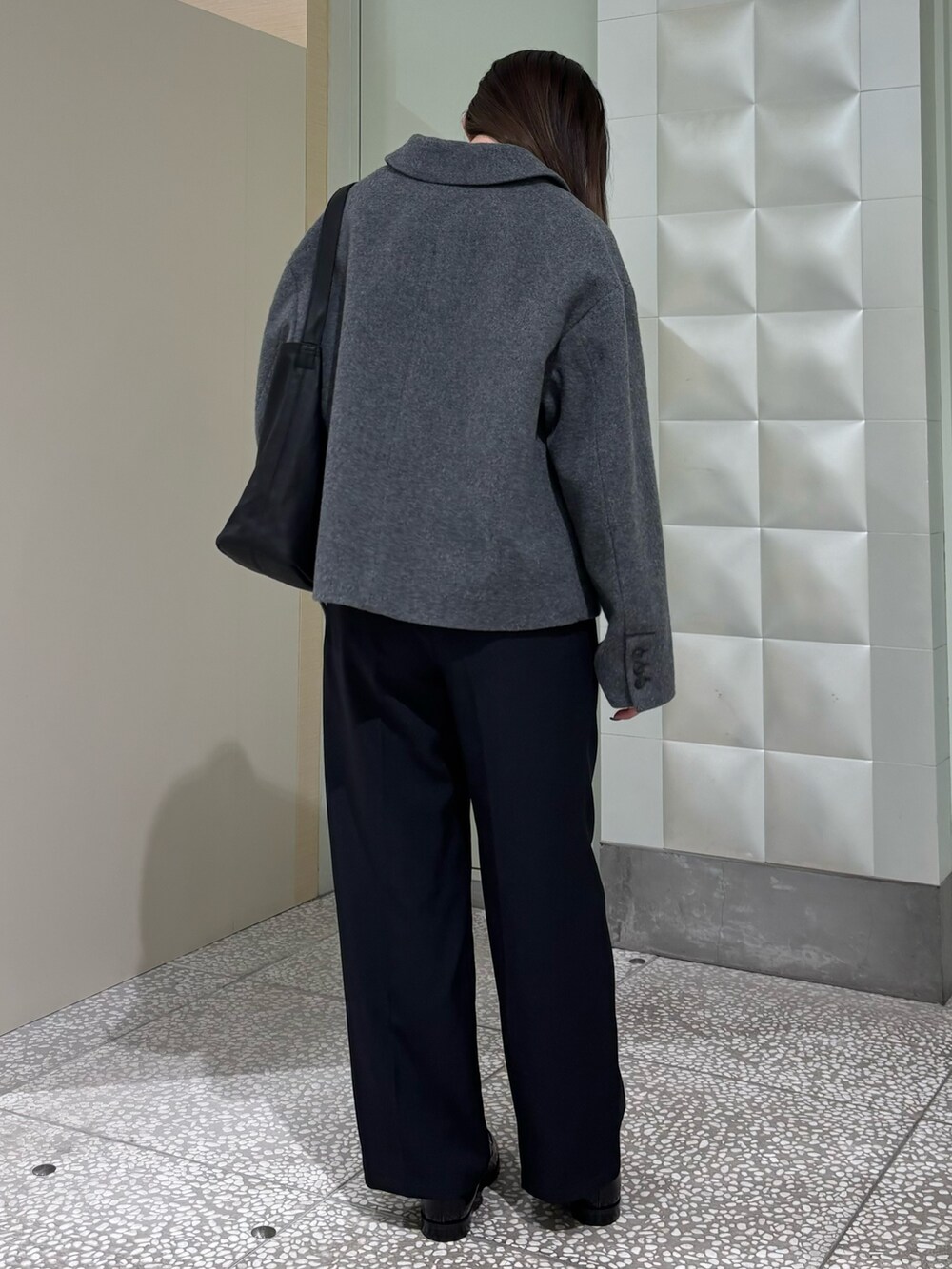 ショート丈のシンプルなコートです。オーバーなサイズ感で厚みのあるトップスと合わせてもかさばらないのでさまざまなスタイリングに合わせていただけます。
