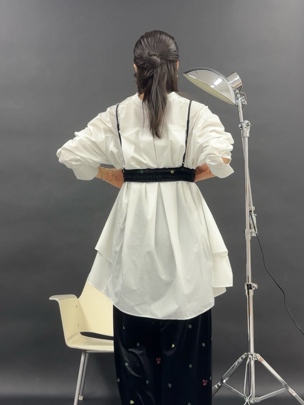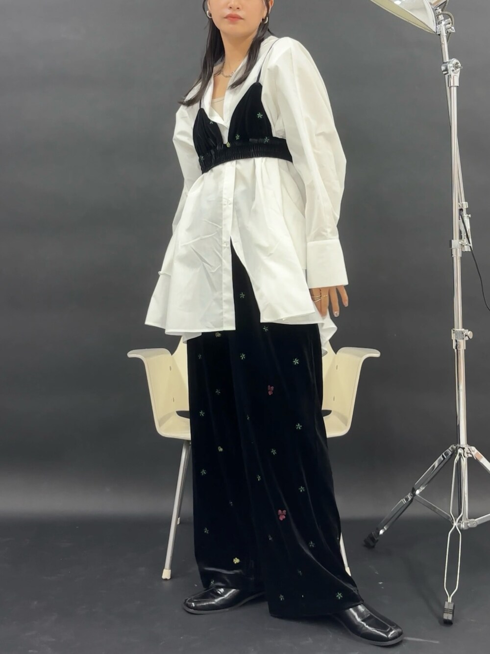 どんなシーンにも使いやすいシャツワンピースをベロアセットアップのブラとパンツを使って秋のレイヤードスタイルにしました!