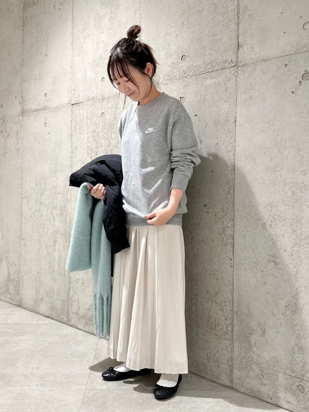 今回は、スウェットにプリーツスカートを合わせた、大人カジュアルコーディネート。